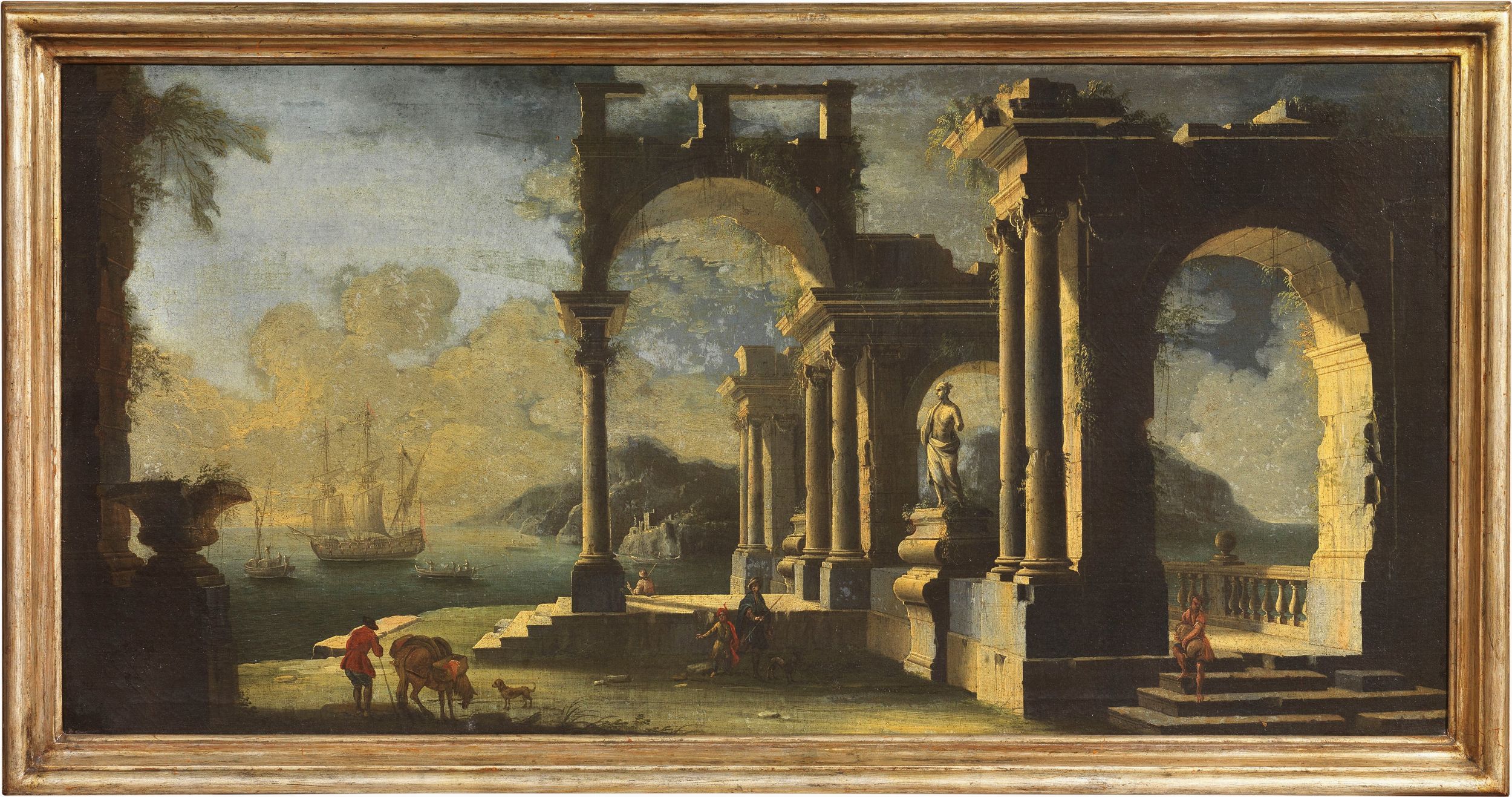 Paesaggio con rovine architettoniche, figure e un vascello nello sfondo
