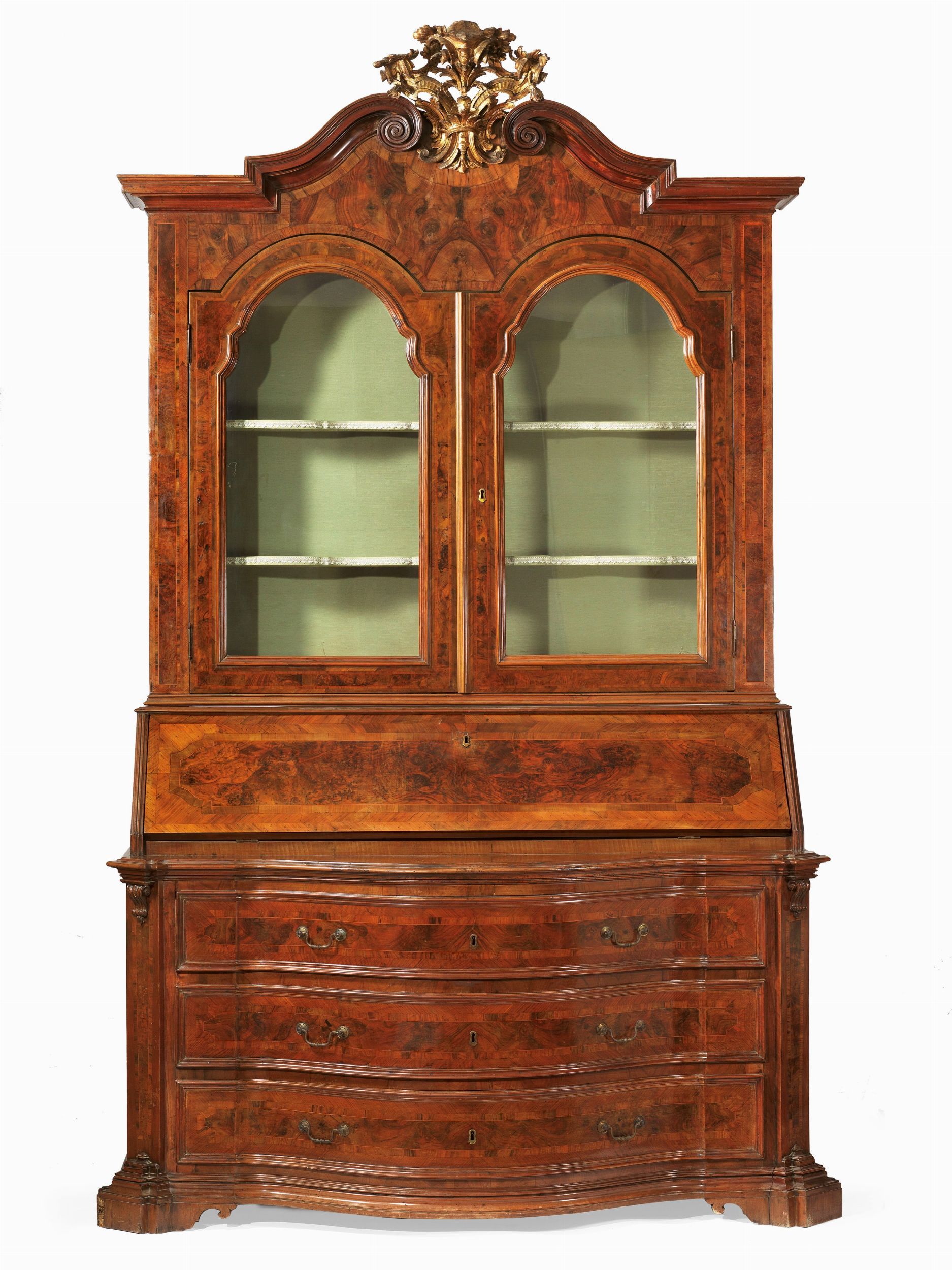 Monumentale trumeau a due corpi lastronato in legno di noce e radica