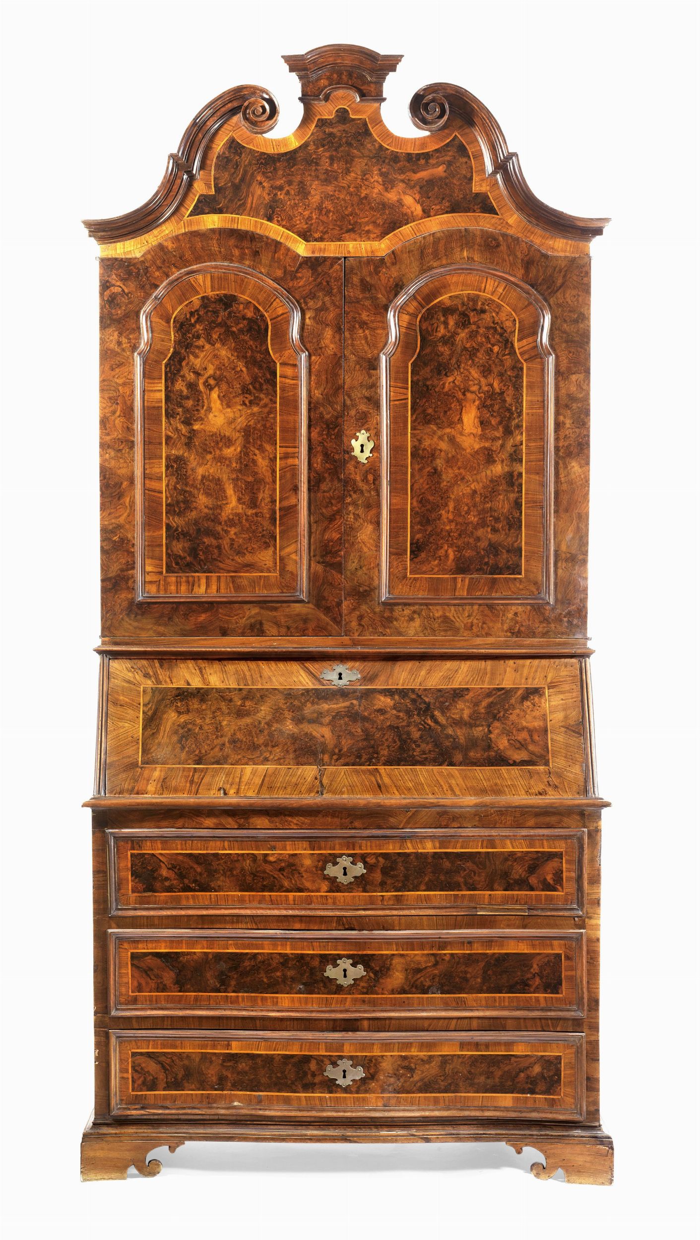 Trumeau a due corpi lastronato in radica e legni vari con filettature in legno c [..]
