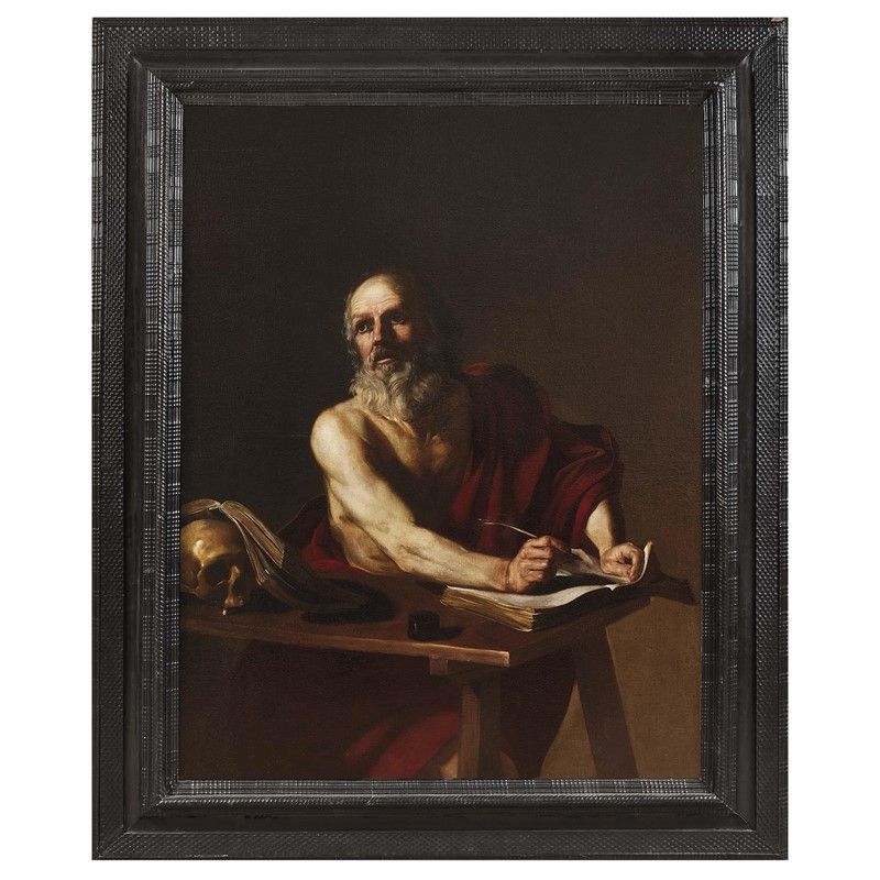 Un riferimento che si traduce, nelle pur diverse raffigurazioni del santo conservate in palazzo Corsini a Firenze, in collezione Koelliker e in una raccolta privata, dalla galleria Voena, in una esibita ricerca formale che privilegia le proporzioni imponenti del protagonista, la qualità del suo incarnato e la ricchezza del panneggio scarlatto che parzialmente lo cela, esaltandolo. Una ricerca che nel nostro dipinto cede il posto al tentativo di restituire la spiritualità del Santo, fragile e quasi esangue nel buio che lo avvolge ma illuminato dalla parola divina che sta traducendo.