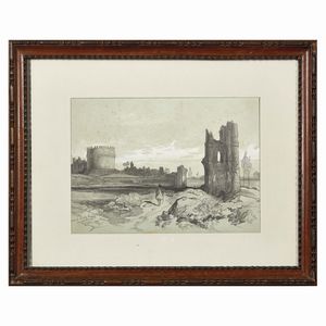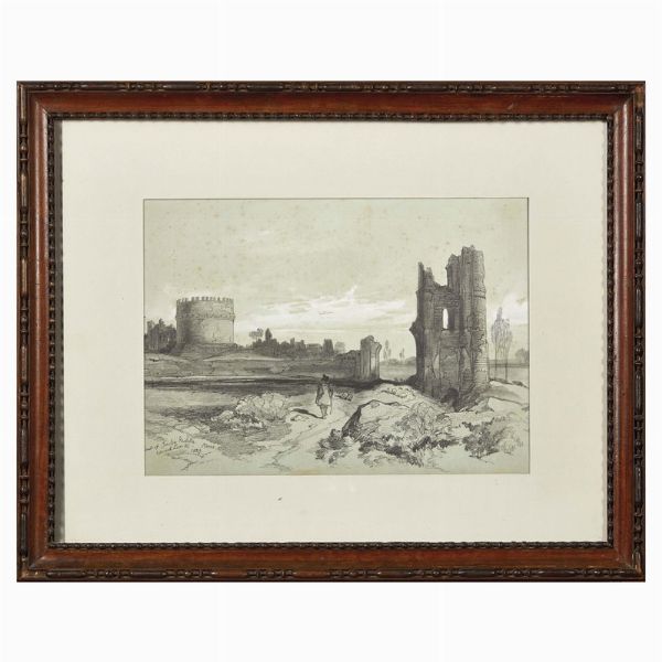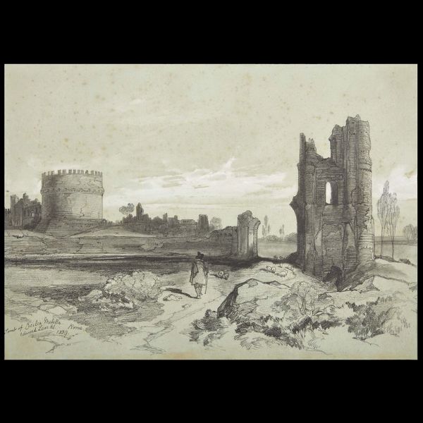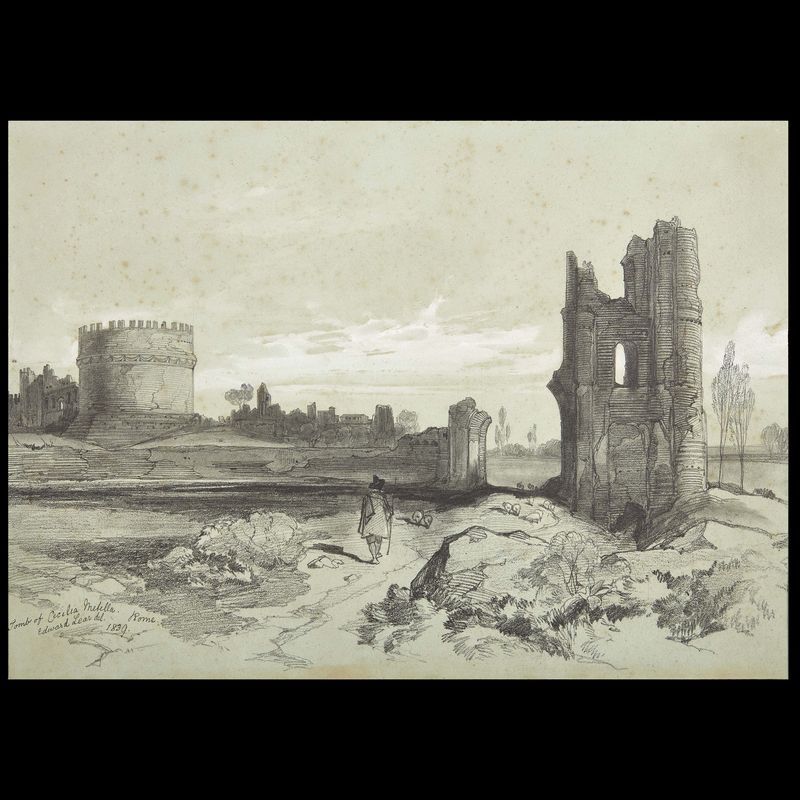 Edward Lear (Holloway 1812 - Sanremo 1888) TOMBA DI CECILIA METELLA, ROMA matita e biacca su carta, cm 25,3x34,5 firmato, titolato e datato Tomb of Cecilia Metella/ Rome/ Edward Lear del 1839 in basso a sinistra