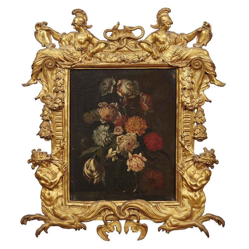 Questo splendido esemplare, ben noto alla critica, appartiene ad un gruppo di sette cornici, tra le quali una soltanto si differenzia per decoro, dimensione e andamento (orizzontale anziché verticale). È parere ormai condiviso che queste siano le opere citate in documenti d’archivio che ricordavano come lo scultore Ercole Ferrata avesse approntato nel 1658 dei modelli in cera secondo “il disegno e volere” di Giovan Paolo Schor per vari ammennicoli, fra cui delle cornici, destinati a una carrozza di velluto nero del Cardinale Chigi. La fusione, la cesellatura e la doratura sarebbero state eseguite dagli spadari Carlo Mattei e Francesco Donati e dall’argentiere Francesco Perone: gli spadari emisero infatti un conto il 12 aprile 1658 per sei cornici uguali e una settima più grande. Giovanni Incisa della Rocchetta, che per primo nel 1956 propose questa identificazione, sembra ipotizzare che le cornici provenienti da Palazzo Chigi a Piazza Colonna siano appunto quelle modellate dal Ferrata nel 1658, poi nel 1679 riutilizzate nella carrozza “delle ghiande” e l’anno dopo tolte da questa e destinate a contenere una serie di sei dipinti di Nicolò Stanchi. A conferma dell’attribuzione dei disegni di questa cornice allo Schor, ricordiamo un suo disegno autografo conservato a Roma nel Gabinetto Nazionale delle Stampe (Inv. 127513) con figure molto simili a quelle che si vedono nella cornice orizzontale.