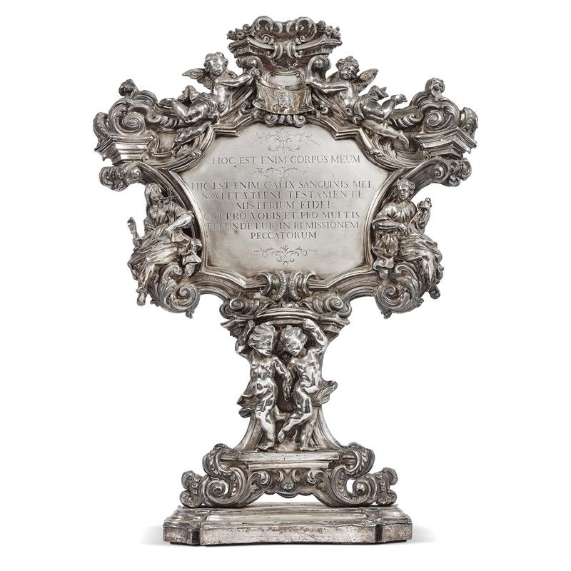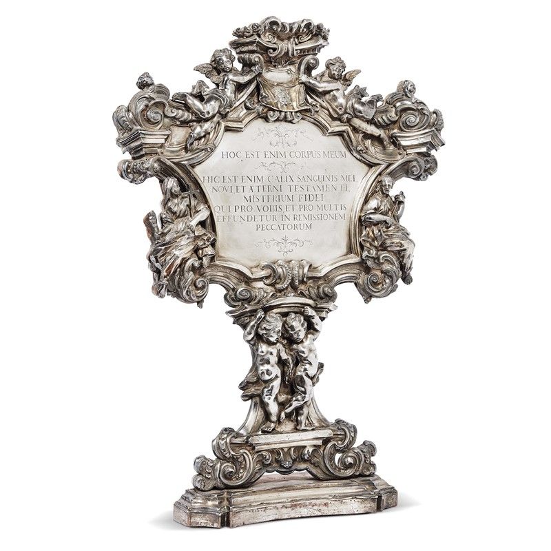 in lamina d'argento applicata su struttura in legno. Base sagomata in rame argentato su cui poggia il fusto realizzato da due putti in rilevo su elementi a volute, a sorreggere la cornice superiore decorata ai lati con due santi assisi e due putti sovrastanti che sostengono uno stendardo con il volto di Cristo nella cimasa. Lo specchio centrale è occupato da un'iscirizone ecclesiastica in lettere capitali HOC EST ENIM CORPUS MEUM / HIC EST ENIM CALIX SANGUINIS MEI, / NOVI ET AETERN TESTAMENTI, / MISTERIUM FIDEI, / QUI PRO VOBIS, ET PRO MULTIS / EFFUNDETUR IN REMISSIONEM / PECCATORUM; cm 74x54x19, g. 5300 lordi