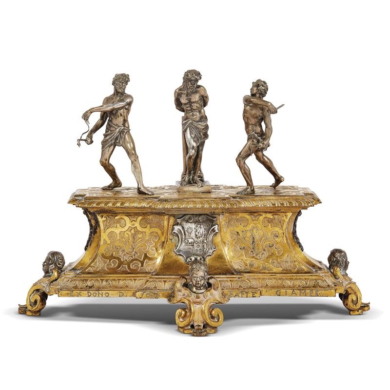 composto da tre figure in argento a rappresentare l'episodio della flagellazine di Cristo, su base in bronzo e rame dorato con applicazioni in argento. Le sculturine in argento, di chiara derivazione algardiana, sono presentate su un alto piedistallo sagomato di impianto rettangolare, con pareti verticali svasate, decorato a bulino e impreziosito da rilievi in argento, che poggia su quattro piedi a voluta decorati con testa di cherubino scolpita a tutto tondo, sempre in argento. Sul fronte stemma araldico non identificato; cm 37x19,5x25