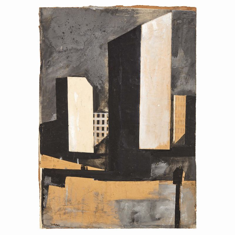 Le prime periferie urbane di Mario Sironi nascono all’inizio degli anni ‘20, la tematica era già stata affrontata dall’artista nel periodo futurista e continuerà a proporla anche in anni successivi. L’ordine prospettico così importante nella fase futurista cede il posto all’edificazione di forme architettoniche solide e metafisiche dalla possente costruzione plastica: case, gasometri, muri, ciminiere, camion, gru, tram e fabbriche, sono forme isolate messe in risalto dai cromatismi monocromi che vanno dal nero al grigio, dall’ocra al bianco. La durezza delle pietre, le case senza porte e finestre, le città senza alberi né giardini, nessun elemento naturale è presente, l’atmosfera è asettica e mesta, l’opera esprime un senso di solitaria eternità, tale drammaticità compositiva è però compensata da una potenza costruttiva classica, capace di erigere monumenti più perenni del bronzo.