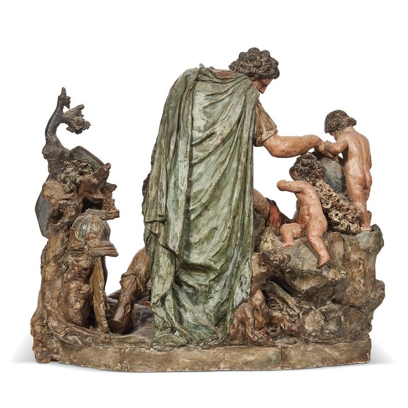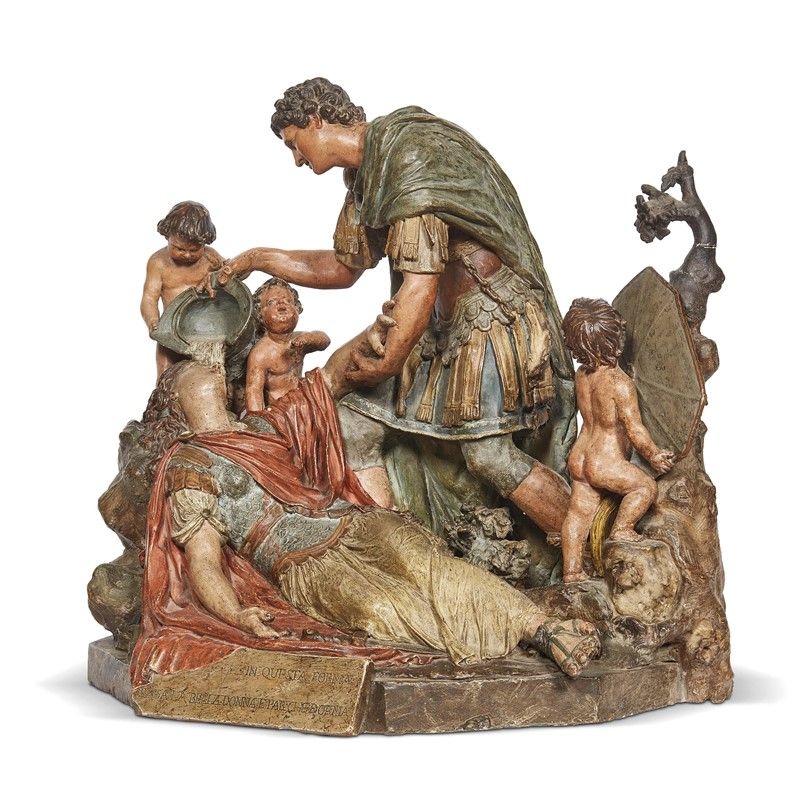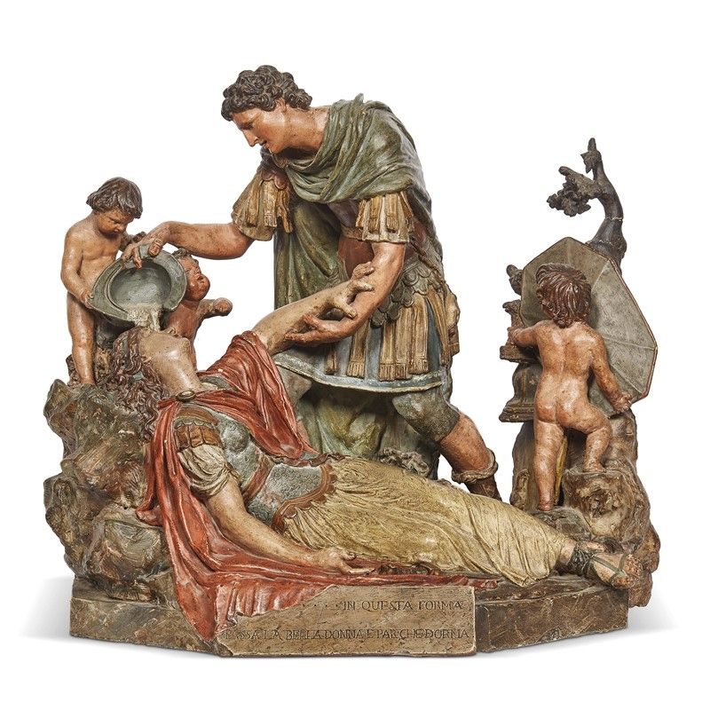 Questo grande e prezioso gruppo plastico in terracotta, dipinto in vivace policromia, traspone in scultura uno degli episodi più celebri della Gerusalemme liberata, poema eroico di Torquato Tasso. Nel canto XII infatti il cavaliere cristiano Tancredi, innamorato della guerriera musulmana Clorinda, è costretto dalla sorte a battersi in duello proprio contro di lei e ad ucciderla; in punto di morte Clorinda si converte e viene battezzata dallo stesso guerriero. Pur essendo notevole la qualità della composizione, al momento non siamo in grado di proporre un’attribuzione specifica per questo gruppo, per il quale però la fonte iconografica sembra possa essere riconosciuta in un dipinto del pittore Gaetano Lapis (Cagli 1706 – Roma 1773) con uguale soggetto pubblicato nel 1994 (A. Mazzacchera, B. Montevecchi, Gaetano Lapis: i dipinti di Cagli, Urbania 1994, pp. 53-54) e attualmente conservato presso la Fondazione Cassa di Risparmio di Pesaro.