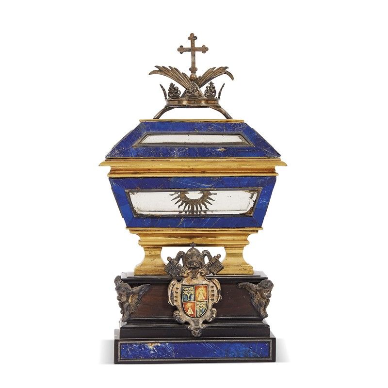 in ebano, lapislazzuli, cristallo di rocca, argento e bronzo dorato, decorato sul fronte con le armi di papa Alessandro VII. Realizzato in foggia di urna su alto piedistallo a parallelepipedo, è sormontato da una corona d'argento attraversata da due foglie di palma incrociate a reggere una piccola croce; all'interno del reliquiario, visibile attraverso le pareti in cristallo di rocca, è presente un sole d'argento iscritto su entrambe le facce DE PALLIO SANCTI JOSEPH; la base, in ebano e lapislazzuli, reca sul fronte lo stemma della famiglia Chigi delle Rovere in argento e smalto e agli angoli quattro teste di cherubini in argento; cm 28x15,5x6,5 Completo di custodia in legno rivestito in cuoio impresso in oro con fregi, stelle e arme papale (cm 31x19x10)