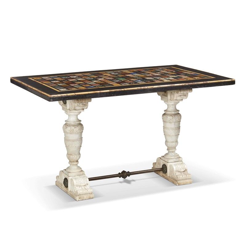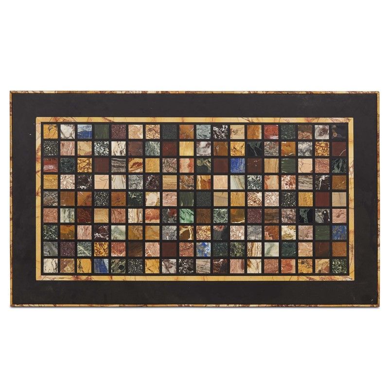 TAVOLO CAMPIONARIO, ROMA, SECOLI XIX/XX in marmi policromi e bronzo patinato. Il piano, di forma rettangolare, è costituito da una lastra di marmo nero bordato di giallo decorato sulla superficie con intarsio a scacchiera di piccoli quadrati di marmi policromi. La base è scolpita in marmo bianco e composta da due sostegni torniti poggianti su piedi a mensola, decorati da intagli e grandi foglie a rilievo, riuniti tra loro da due traverse in bronzo con nodo centrale e rosoni alle estremità; cm 86x152x89