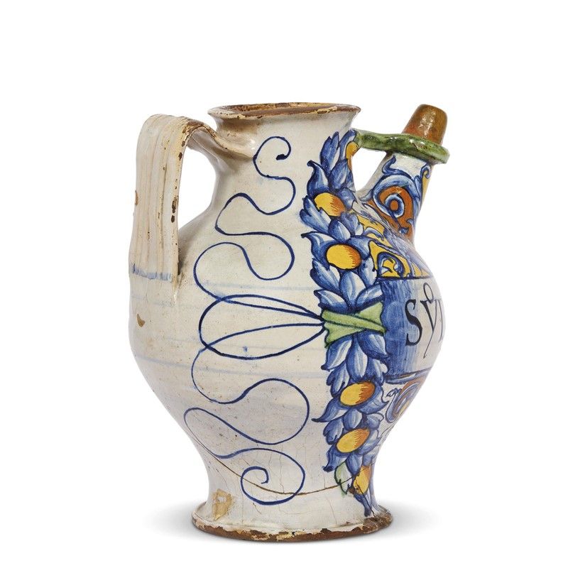 in maiolica dipinta in policromia, corpo di forma globulare con stretto collo cilindrico e piede svasato, beccuccio tubolare collegato nella parte superiore da cordicella e ansa a nastro. L’ornato si concentra nella parte anteriore, con una ghirlanda fogliata di tipo robbiano con piccoli frutti fermata da nastri incrociati, che proseguono con svolazzi sul retro, al cui interno si trova il cartiglio con l’iscrizione SYO DAMATRICE nella fascia centrale, uno stemma araldico non identificato entro riserva circolare affiancato da girali nella parte inferiore, e da un monogramma con doppia croce posto tra una coppia di mostri marini nella zona del cannello; alt. cm 24,5, diam. bocca cm 8,6, diam. piede cm 11,8