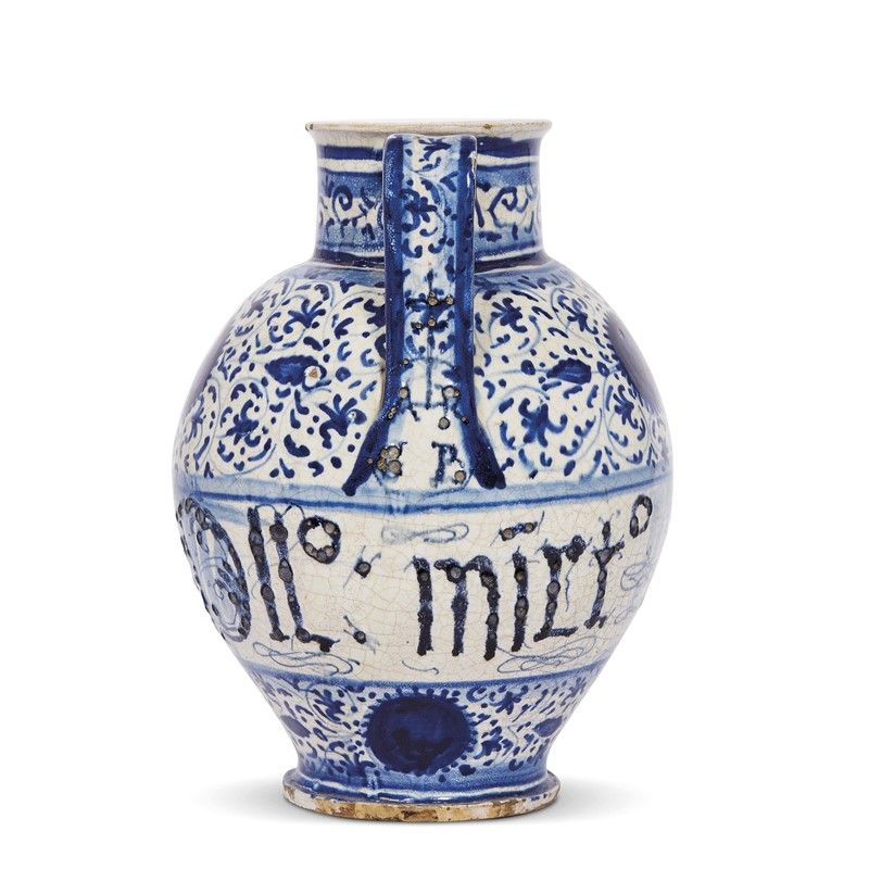 in maiolica dipinta in policromia con prevalenza del blu, corpo piriforme con stretto collo cilindrico appena svasato su piede a disco, beccuccio tubolare appena rastremato in cima e ansa a nastro. L’intera superficie del contenitore farmaceutico mostra il tipico decoro cosiddetto “alla porcellana”, caratterizzato da sottili decori a trama vegetale intervallati da corolle a disco con il bordo dentellato, ad eccezione della fascia centrale, che ospita un largo cartiglio con iscrizione Olio.mirto e che si chiude sul fronte, sotto il cannello, con tocchi di giallo ocra. Alla base dell’ansa in blu sono tracciate alcune lettere capitali; alt. cm 27, diam. bocca cm 9,8, diam. piede cm 10,8