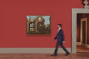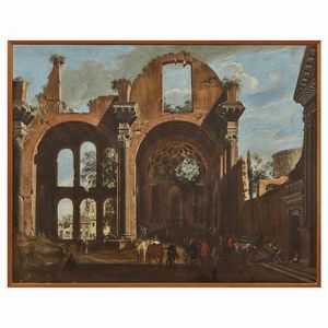 Se la Basilica di Costantino (generalmente nota con l’attribuzione a Massenzio) è protagonista di numerose vedute codazziane, più rara è la sua contestualizzazione, fondamentalmente realistica se pure con qualche aggiustamento prospettico, grazie alla raffigurazione del Colosseo e della facciata di Santa Francesca Romana perpendicolare alla Basilica stessa, come pure della Torre delle Milizie sullo sfondo.