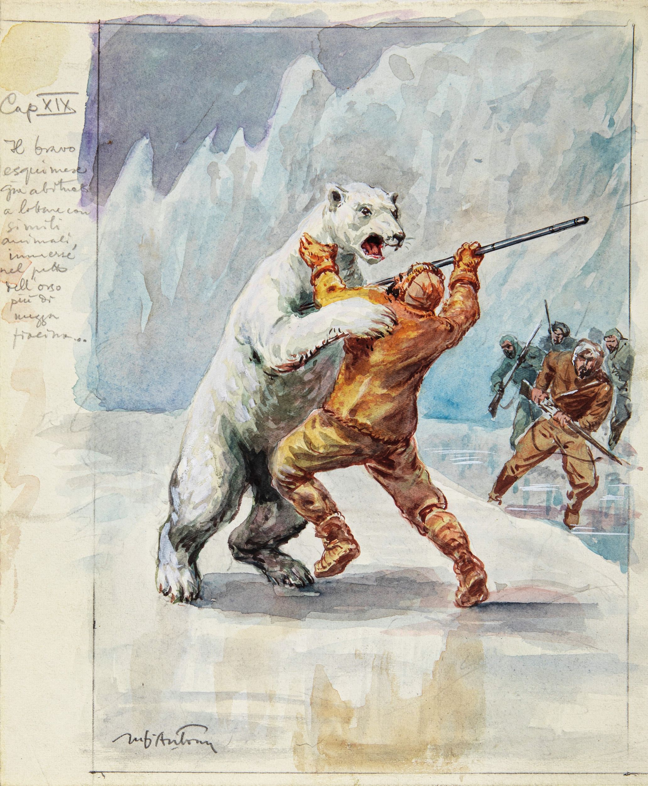 1948 Illustrazione originale realizzata da D’Antona per il romanzo Al Polo Nord di Emilio Salgari edito da Viglongo nel 1948. Firmata.
