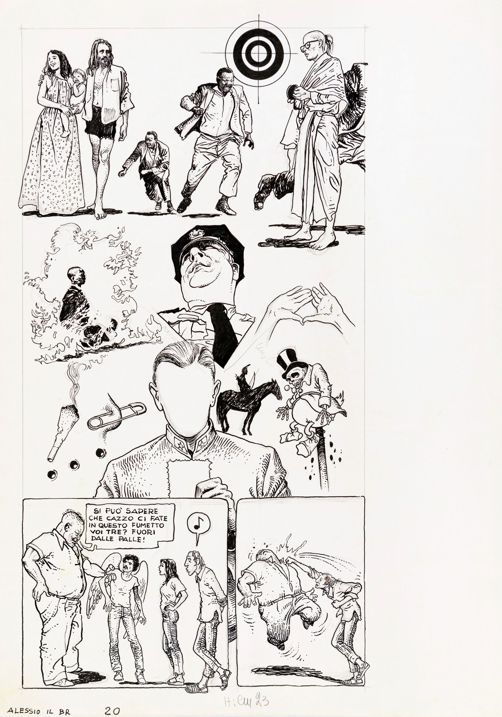 matita e china su cartoncino, 35,5 x 50 cm 1977 Tavola originale realizzata da Manara per Alessio il Borghese rivoluzionario, edita a pag. 20 per la prima volta sulla rivista AlterAlter nel 1977 sui testi di Silverio Pisu. Un'opera dai connotati fortemente politici e tecnicamente tra i migliori lavori di Manara.