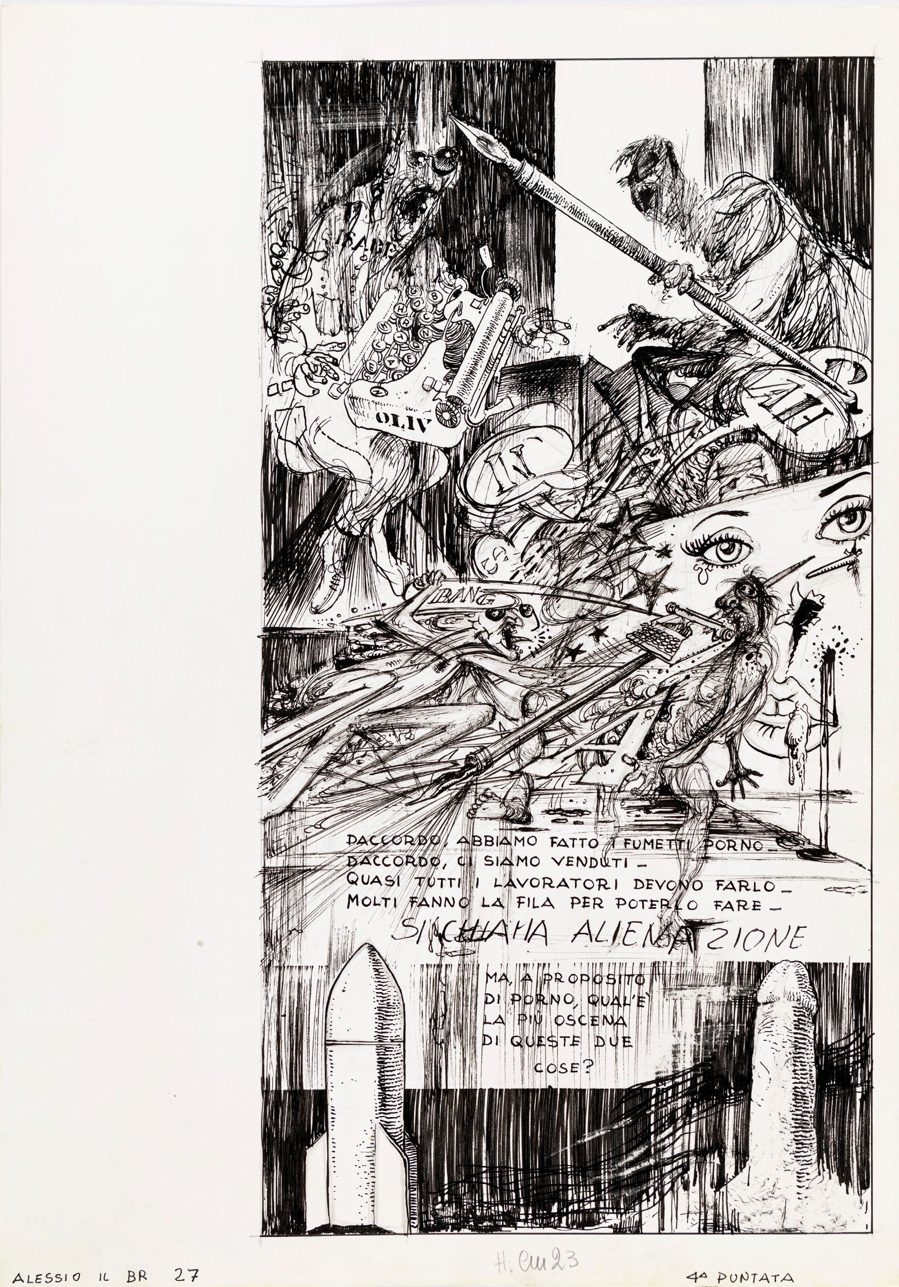 matita e china su cartoncino, 35,5 x 50 cm 1977 Tavola originale realizzata da Manara per Alessio il Borghese rivoluzionario, edita a pag. 27 per la prima volta sulla rivista AlterAlter nel 1977 sui testi di Silverio Pisu. Un'opera dai connotati fortemente politici e tecnicamente tra i migliori lavori di Manara.
