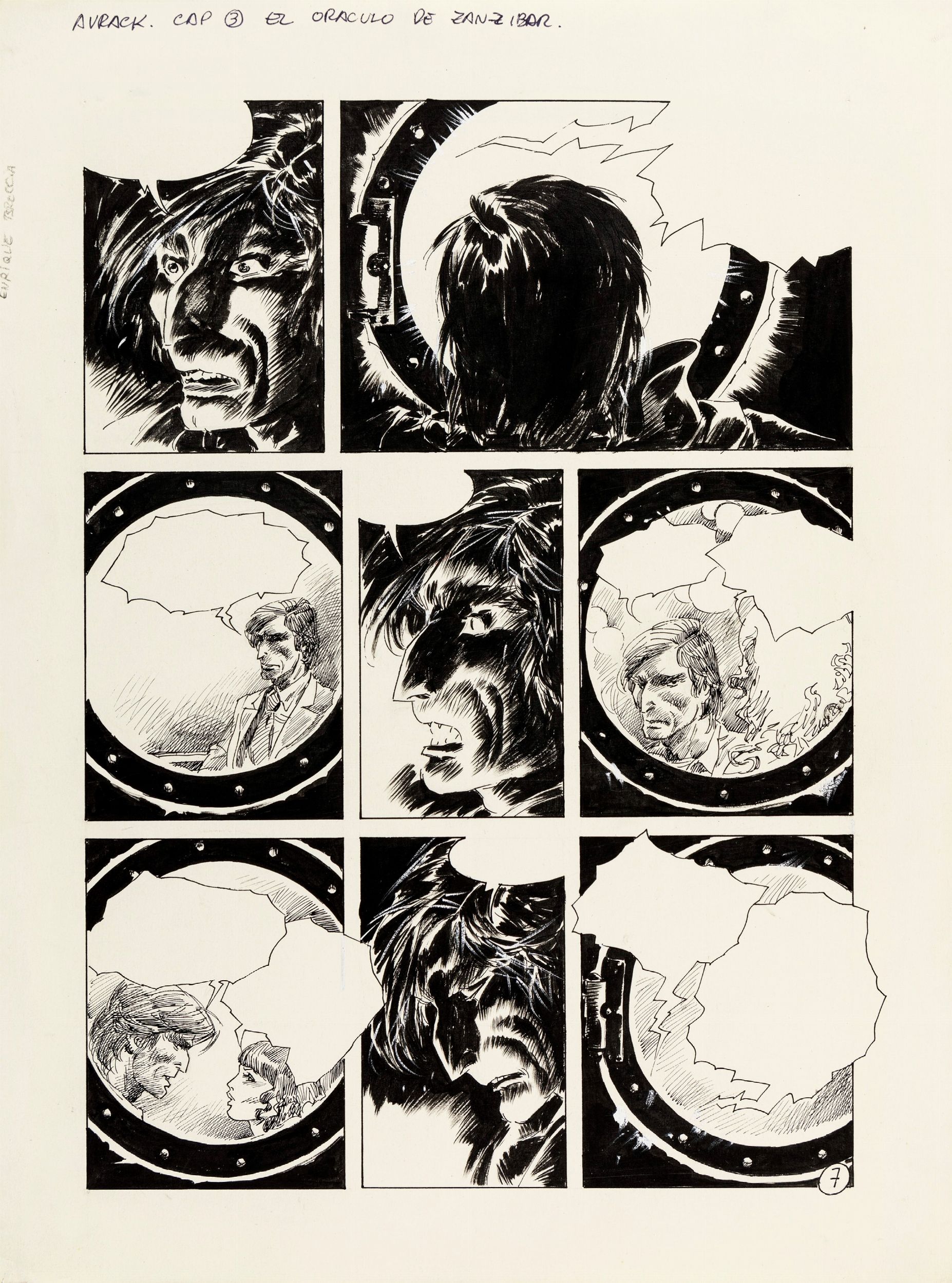 matita e china su cartoncino, 30 x 40 cm 1987 Tavola originale realizzata da Breccia per El oraculo de Zanzibar, pag. 7 del terzo capitolo di Avrack, saga fantascientifica edita per la prima volta in argentina su Super Skorpio n. 141 nel 1987. Testi di Ricardo Barreiro. Lieve piega all'angolo inferiore sinistro.