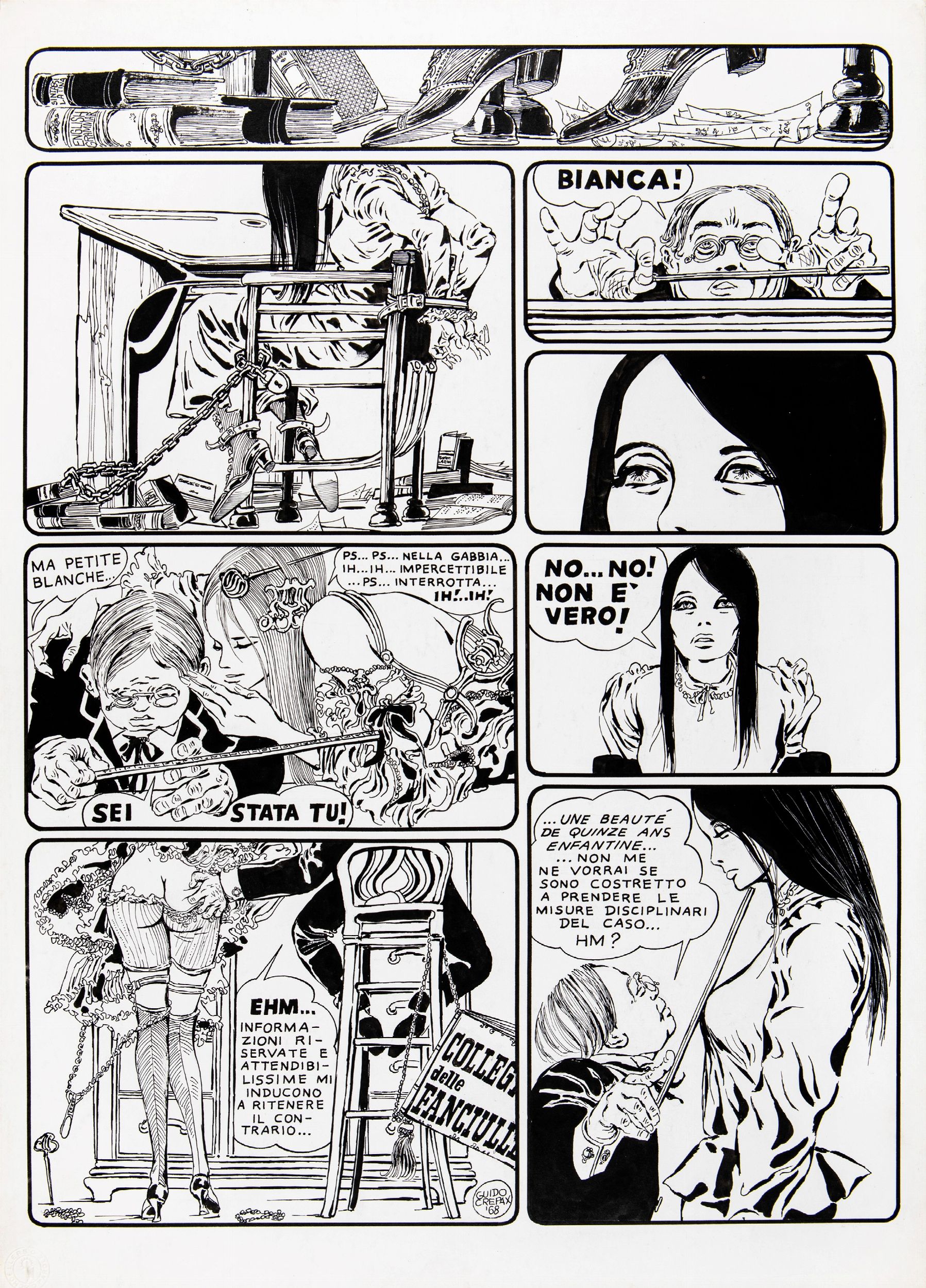 1968 Title page originale realizzata da Crepax per il volume La casa matta, edita per la prima volta dalla casa editrice EDIP nel 1969. Dopo il successo riscosso con la sua Valentina, nata nel 1965 sulla rivista Linus, Crepax nel 1968 si dedica ad un’altra eroina, Bianca. Con La casa Matta, Crepax da vita ad uno dei suoi personaggi più amati e sicuramente tra i più trasgressivi, la presente pagina è la prima apparizione in assoluto della seducente Bianca, nella sue prime edizioni infatti la vignetta in alto fu coperta dal titolo dell’opera (si veda immagine allegata). Di grande rarità. Firmata e datata.