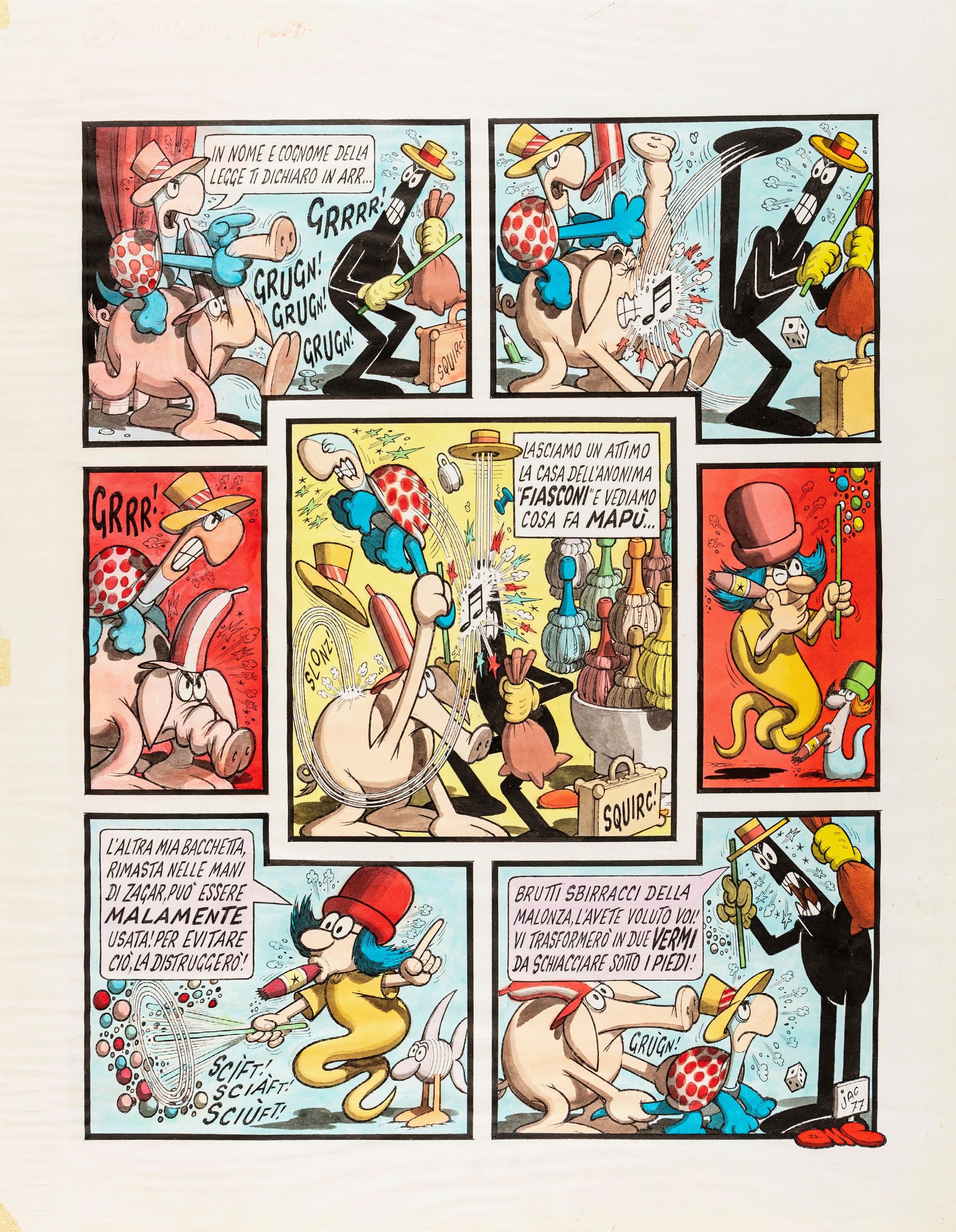 matita, china e acrilici su cartoncino, 50 x 64 cm 1977 Tavola originale realizzata da Jacovitti per Cipzagmapu nel 1977, ma pubblicata solo successivamente dal Club Anni ’30 nel 1988. Lievi ondulature della carta. Firmata con lisca di pesce e datata.