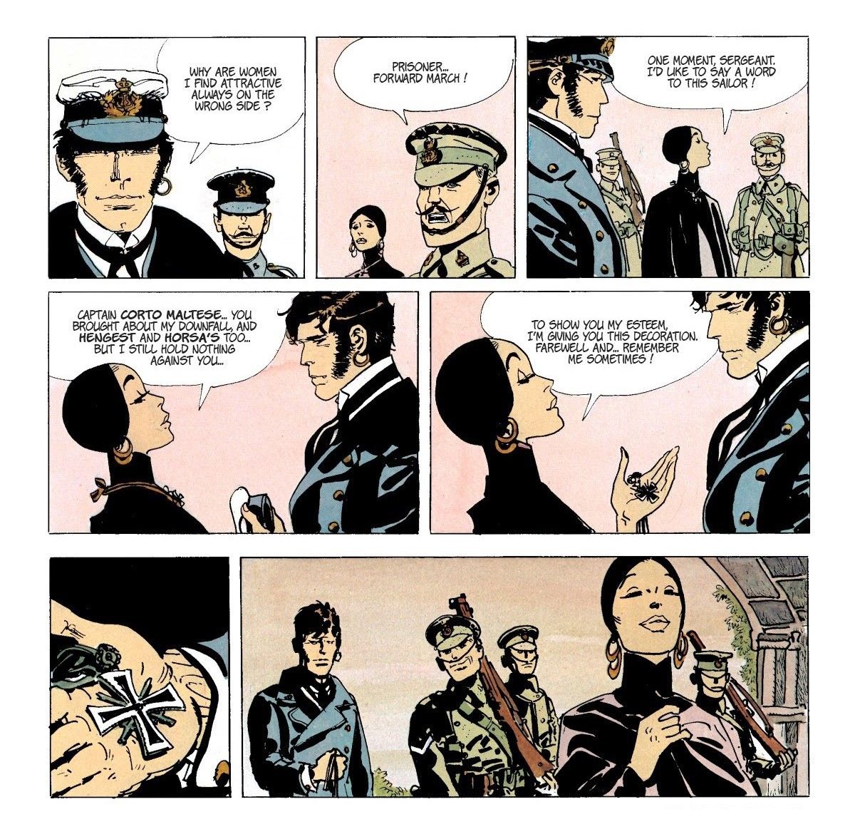 1972 Lotto composto da 3 tavole preliminari realizzate da Pratt per la sedicesima avventura di Corto Maltese intitolata Sogno di un mattino di mezzo inverno, pubblicata per la prima volta in Francia su Pif Gadget nel 1972. Nel 1917 Corto è a Stonehenge, in Inghilterra. Mentre dorme si svolge l'incontro tra quattro creature fantastiche della mitologia anglosassone: Puck, Oberon, Morgana e Merlino e il motivo è il bisogno di trovare qualcuno che riesca a contrastare l'imminente sbarco dei tedeschi che minaccia di spazzare via il magico mondo di questi esseri; la scelta ricade su Corto Maltese. Per la prima volta abbiamo la possibilità di sbirciare nel processo creativo del grande Pratt, in queste tavole abbozzate, ma già pienamente evocative, possiamo ammirare Corto immerso nella nebbia di Stonehenge mentre parla con Puck sotto forma di corvo, vediamo poi la bella Rowena e il soldato tedesco Vortigern. Provenienza: Heritage Auction - Lot #91200 - Jun 8, 2019.