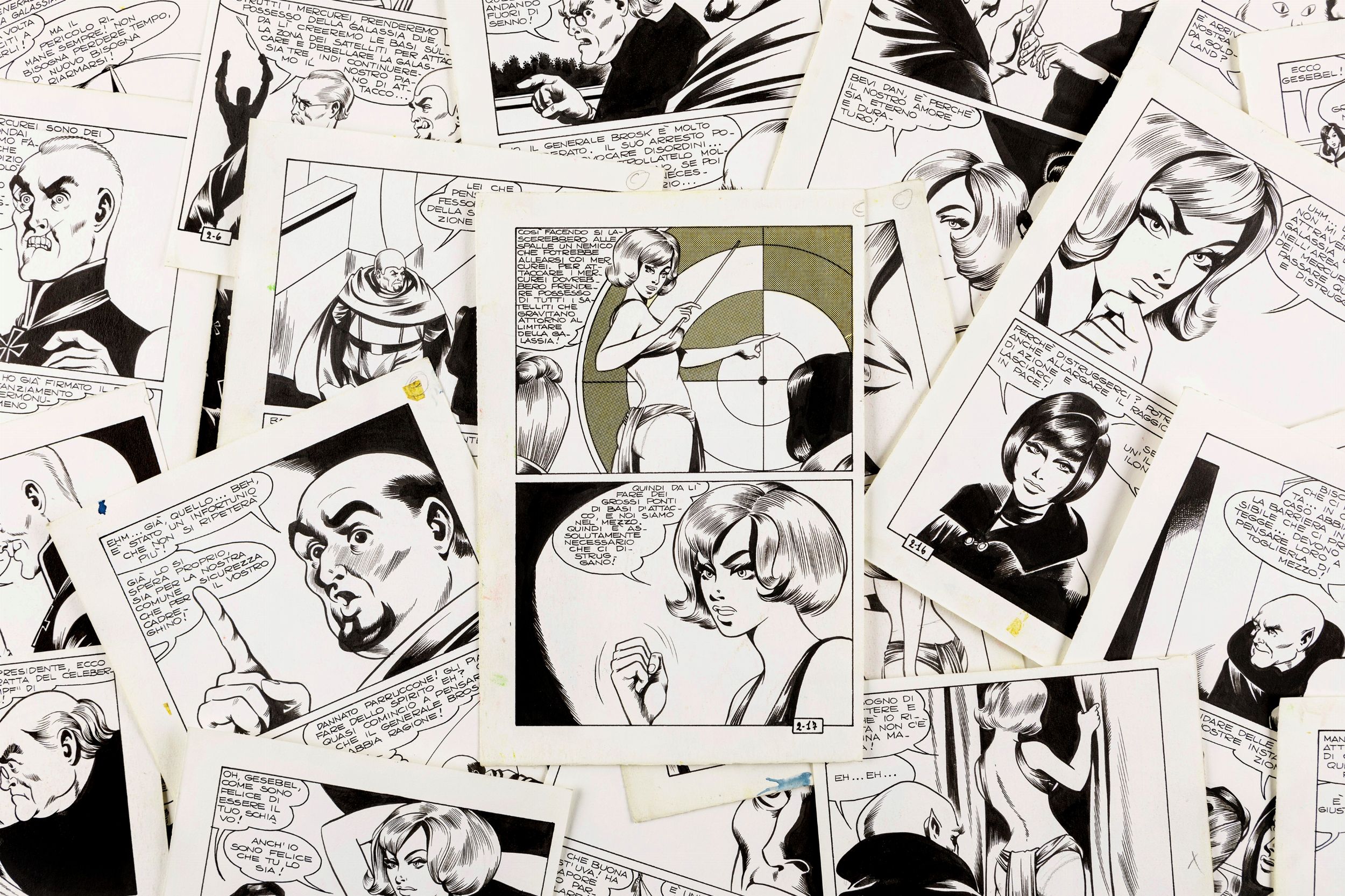 matita, china e retino su cartoncino, 17,5 x 25,5 cm circa ciascuno 1966 Storia semi completa composta da 118 tavole originali realizzate da Magnus per Minaccia nel cosmo, edita su Gesebel n. 2 dalla Editoriale Corno nel Marzo 1966. Nato dal genio di Max Bunker e Magnus (che ne disegnò solo i primi 6 numeri), Gesebel è entra