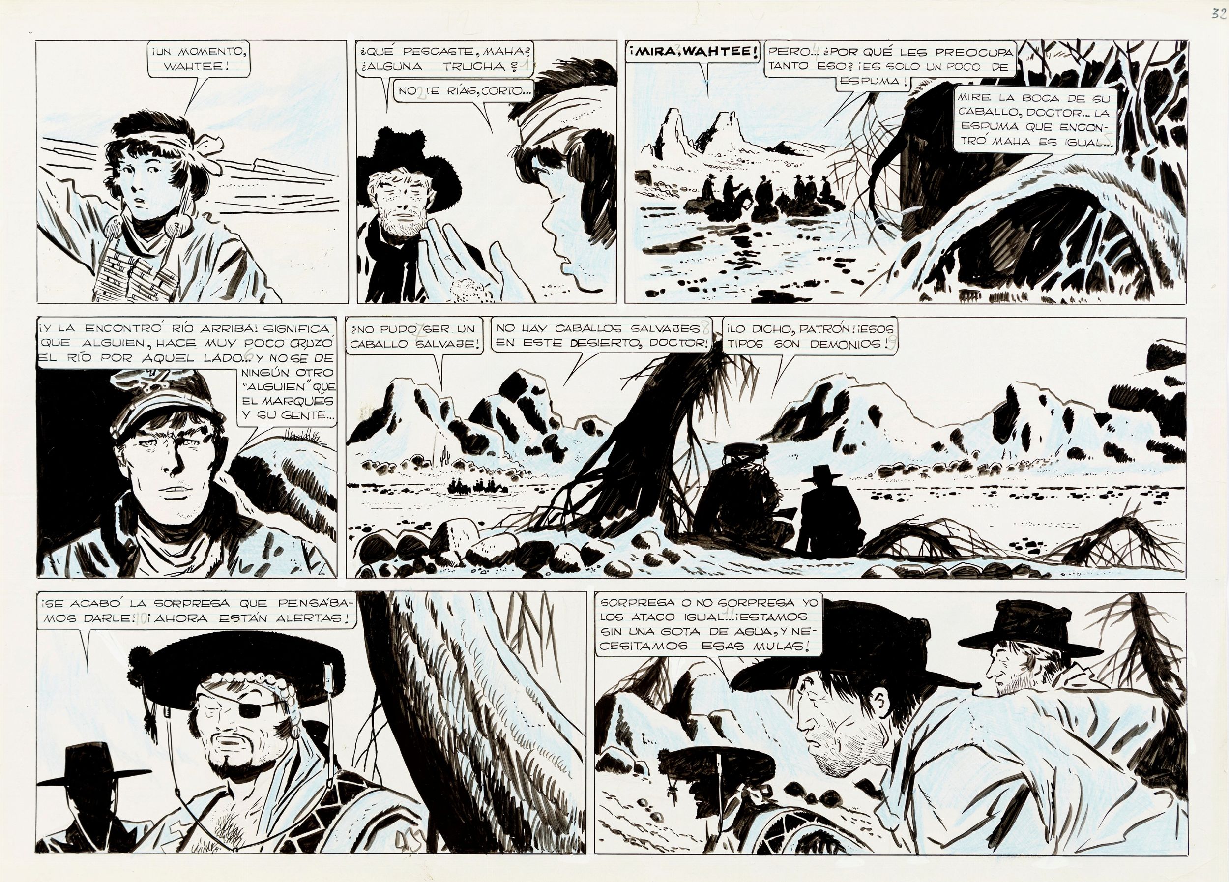 matita, pastello e china su cartoncino, 49,5 x 36 cm 1959 Tavola originale realizzata da Pratt per Il castello di Titlān, pag. 32 dell´ultima avventura de Il Sergente Kirk pubblicata per la prima volta in Argentina su Hora Cero Suplemento Semanal n. 90 dall´Editorial Frontera nel Maggio 1959, ristampata in Ita