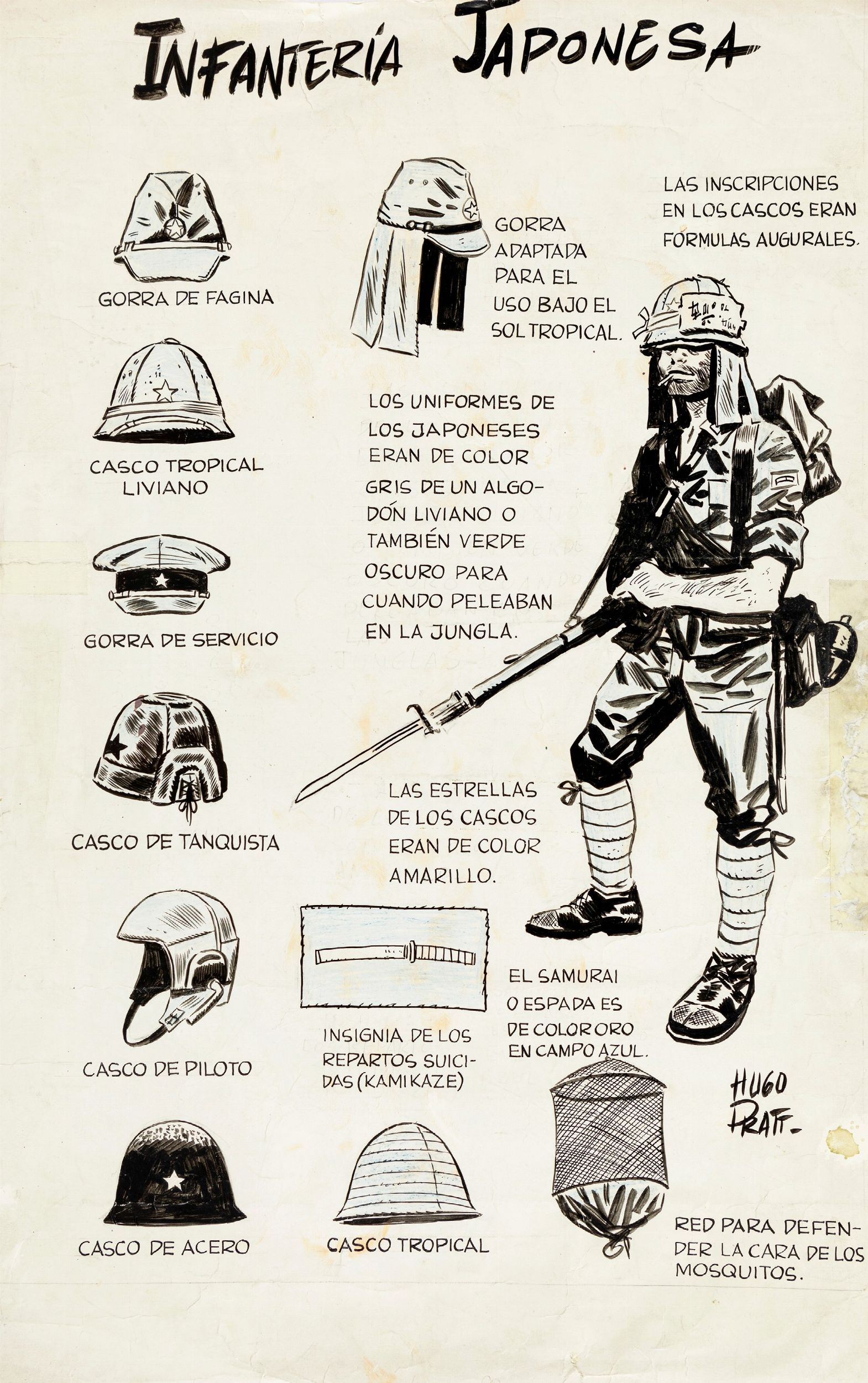 matita, pastello e china su cartoncino, 32 x 51 cm 1961 Tavola originale realizzata da Pratt edita sulla rivista argentina Hora Cero Extra n. 39 a pag. 10 nell'Aprile 1961. La passione di Pratt per le divise militari traspare appieno in questa importante opera del suo periodo argentino. Divere pieghe e piccoli strappi ai margini, nastro adesivo al margine destro e sinistro. Firmata.