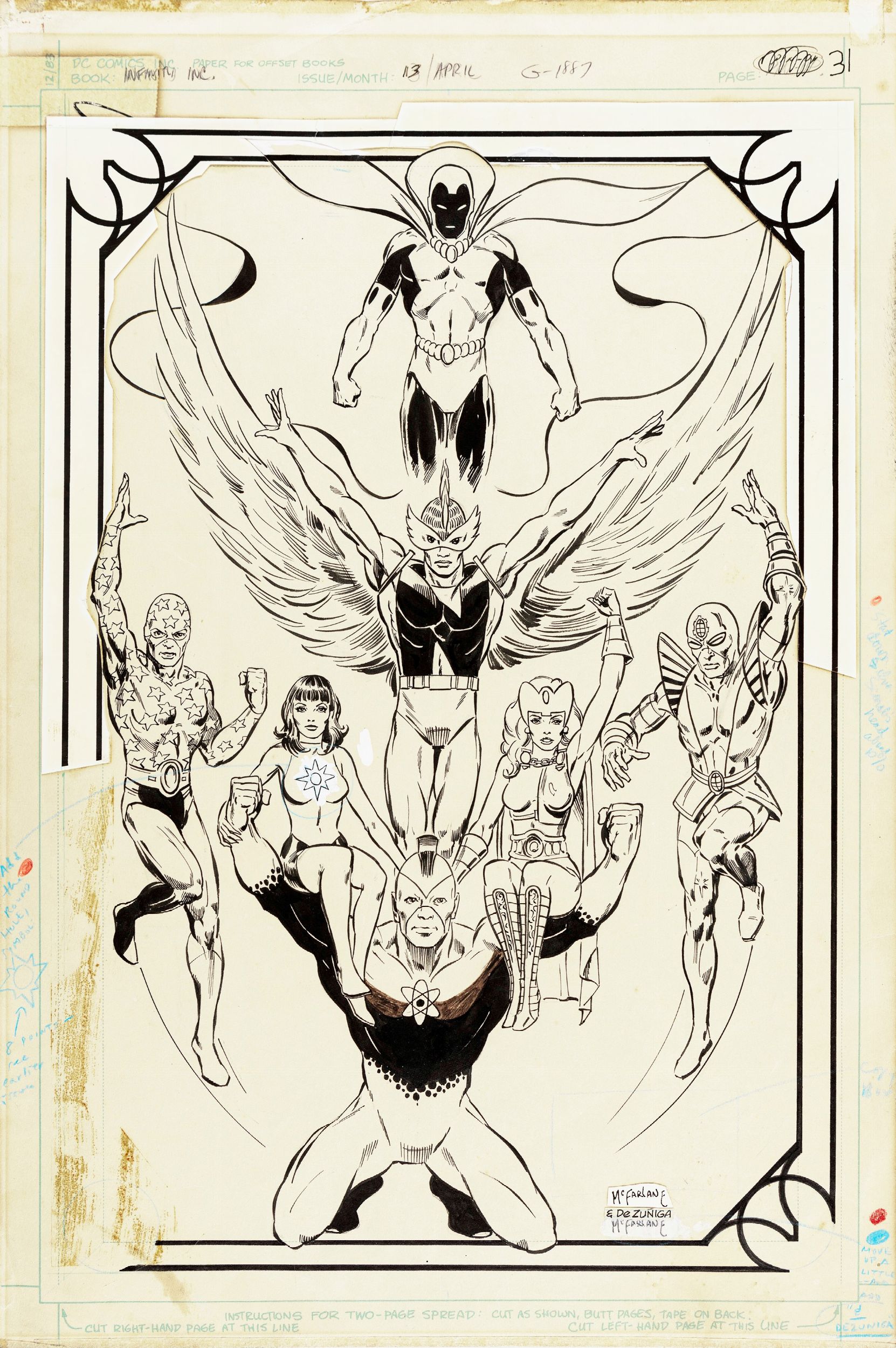 matita e china su cartoncino DC, 33 x 50,5 cm 1985 Splash page originale realizzata da McFarlane pubblicata su Infinity Inc. n. 13 a pag. 24 dalla DC nel 1985. L'opea da noi presentata è la prima interpretazione in assoluto di McFarlane per i personaggi di Infinity Inc., la DC infatti decise di pubblicare
