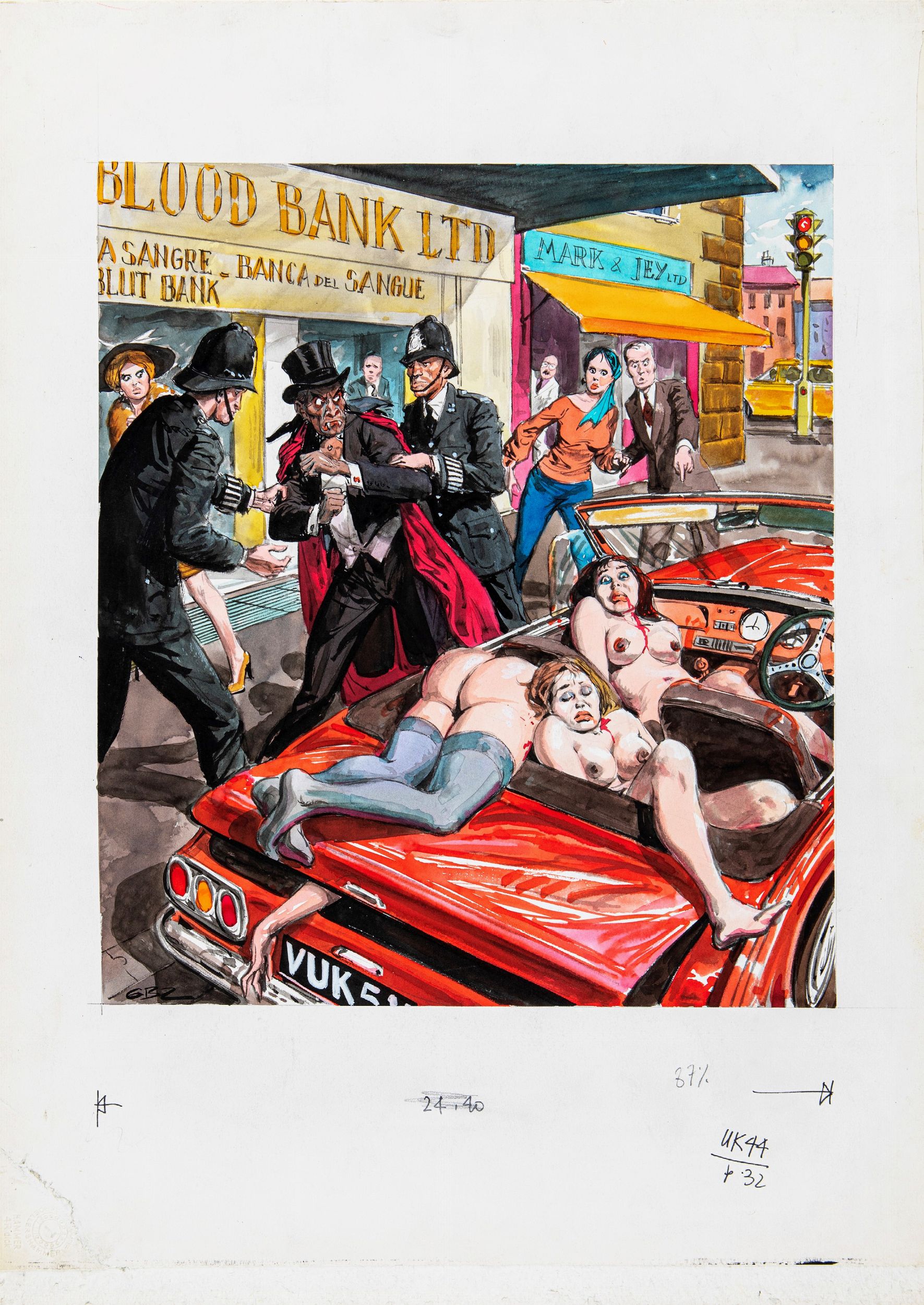 matita, china e acquerello su cartoncino applicato a cartone, 36,5 x 49 cm 1972 Illustrazione originale realizzata da Buzzelli per il settimanale eroticomico Menelik n. 44 del 1972. Opera recentemente pubblicata in Francia sul volume Buzzelliades a pag. 137 da Les Cahiers Dessinés nel 2021. Il rapporto tra Buzzelli e l'erotismo è sempre stato a dir poco complesso, portando il maestro romano a ideare opere folli quanto scomode in affollatissime composizioni in bilico tra la bizzarria di Grosz e l'ironia di Jacovitti. Strappo restaurato all'angolo inferiore sinistro. Firmata.