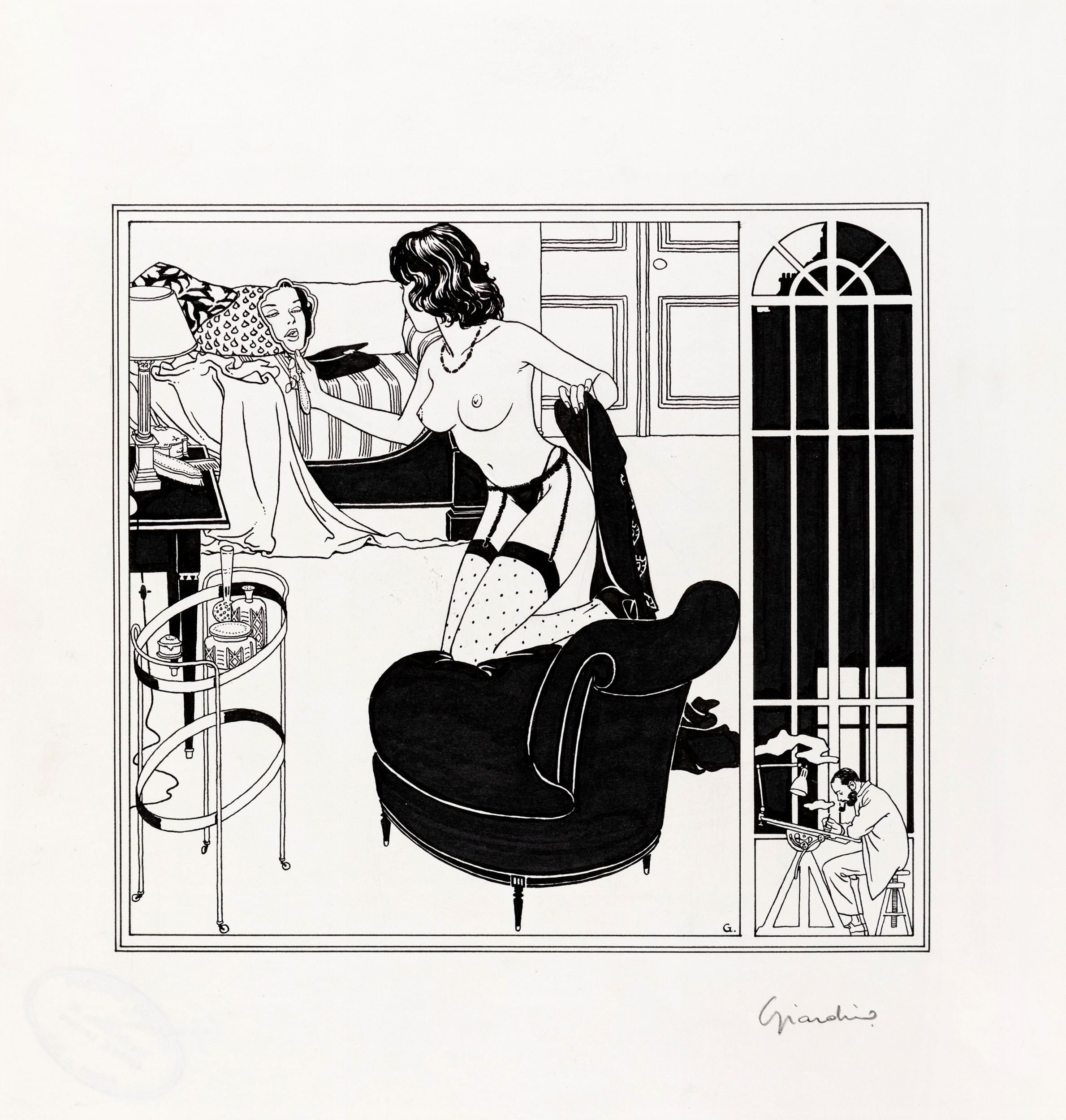 matita e china su cartoncino, 31,5 x 33,5 cm 1986 Illustrazione originale realizzata da Giardino per La Finestra di Notte, breve racconto erotico senza testo pubblicato per la prima volta in bianco e nero nel volume Vittorio Giardino Glamour Book edito dalla Glamour International nel 1986. Un'opera raffinata e sensuale che nel 1998 con il titolo Fenêtres de nuit divenne un portfolio contenente 8 serigrafie a colori (riproducendo a colori i disegni dell'86) stampato dalla celebre libreria Raspoutine di Losanna in soli 200 esemplari. Giardino mette in scena la turbolenta notte di un disegnatore (un palese autoritratto) sorpreso a spiare dalla finestra una bellissima fanciulla che diventa inconsapevolmente la sua musa ispiratrice fino ad un brusco epilogo. Firmata al fronte e al retro con timbro dell'artista.