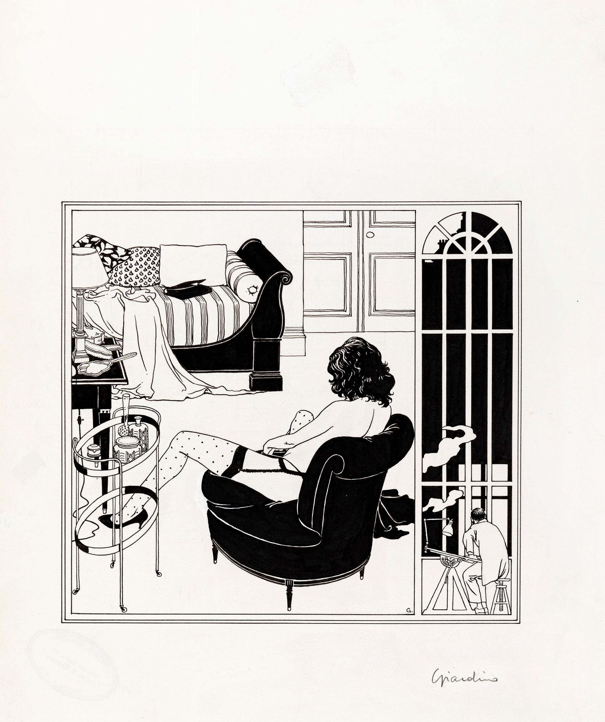 1986 Illustrazione originale realizzata da Giardino per La Finestra di Notte, breve racconto erotico senza testo pubblicato per la prima volta in bianco e nero nel volume Vittorio Giardino Glamour Book edito dalla Glamour International nel 1986. Un'opera raffinata e sensuale che nel 1998 con il titolo Fenêtres de nuit divenne un portfolio contenente 8 serigrafie a colori (riproducendo a colori i disegni dell'86) stampato dalla celebre libreria Raspoutine di Losanna in soli 200 esemplari. Giardino mette in scena la turbolenta notte di un disegnatore (un palese autoritratto) sorpreso a spiare dalla finestra una bellissima fanciulla che diventa inconsapevolmente la sua musa ispiratrice fino ad un brusco epilogo. Firmata al fronte e al retro con timbro dell'artista.