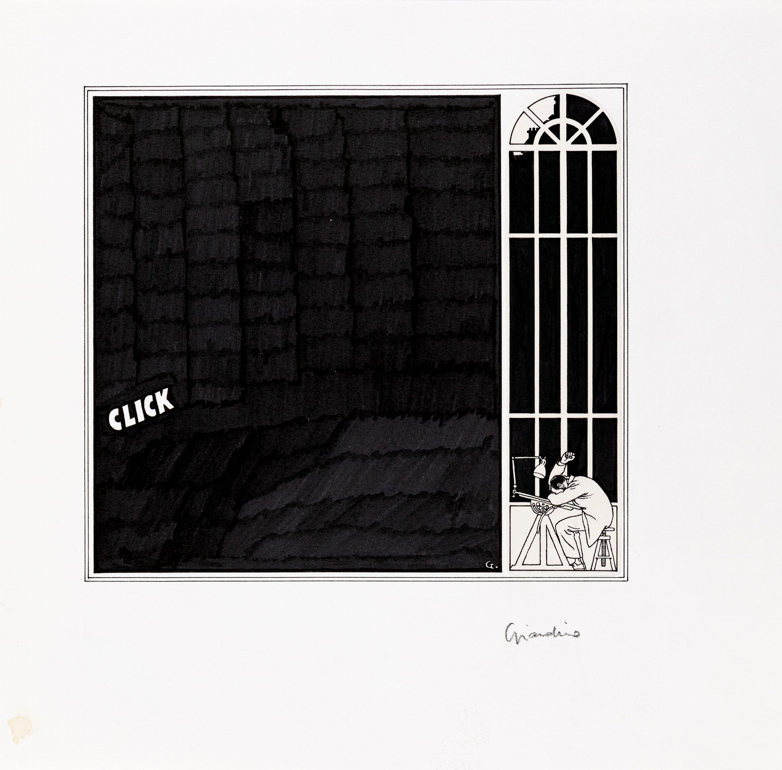 matita e china su cartoncino, 34 x 33 cm 1986 Illustrazione originale realizzata da Giardino per La Finestra di Notte, breve racconto erotico senza testo pubblicato per la prima volta in bianco e nero nel volume Vittorio Giardino Glamour Book edito dalla Glamour International nel 1986. Un'opera raffinata e sensuale che nel 1998 con il titolo Fenêtres de nuit divenne un portfolio contenente 8 serigrafie a colori (riproducendo a colori i disegni dell'86) stampato dalla celebre libreria Raspoutine di Losanna in soli 200 esemplari. Giardino mette in scena la turbolenta notte di un disegnatore (un palese autoritratto) sorpreso a spiare dalla finestra una bellissima fanciulla che diventa inconsapevolmente la sua musa ispiratrice fino ad un brusco epilogo. Firmata al fronte e al retro con timbro dell'artista.