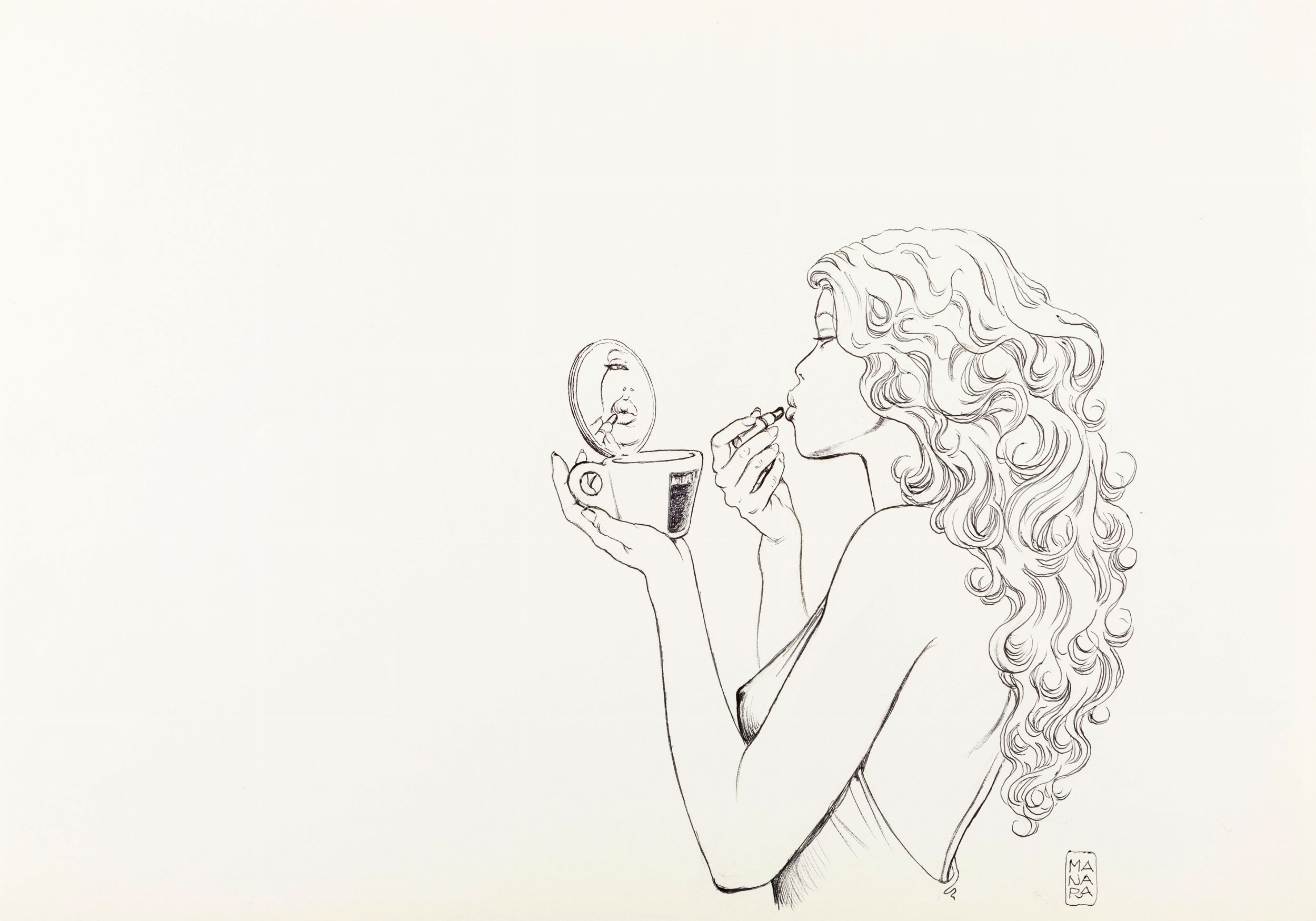 matita e biro su cartoncino, 50 x 35,5 cm 2011 Illustrazione originale realizzata da Manara per il volume Lavazza: con te partiṛ, edito dalla Rizzoli nel 2011. Un volume celebrativo che raccoglie le immagini simbolo dei primi 20 calendari Lavazza, accompagnate dalle inconfondibili donnine del maestro indiscusso dell’eros. Firmata.