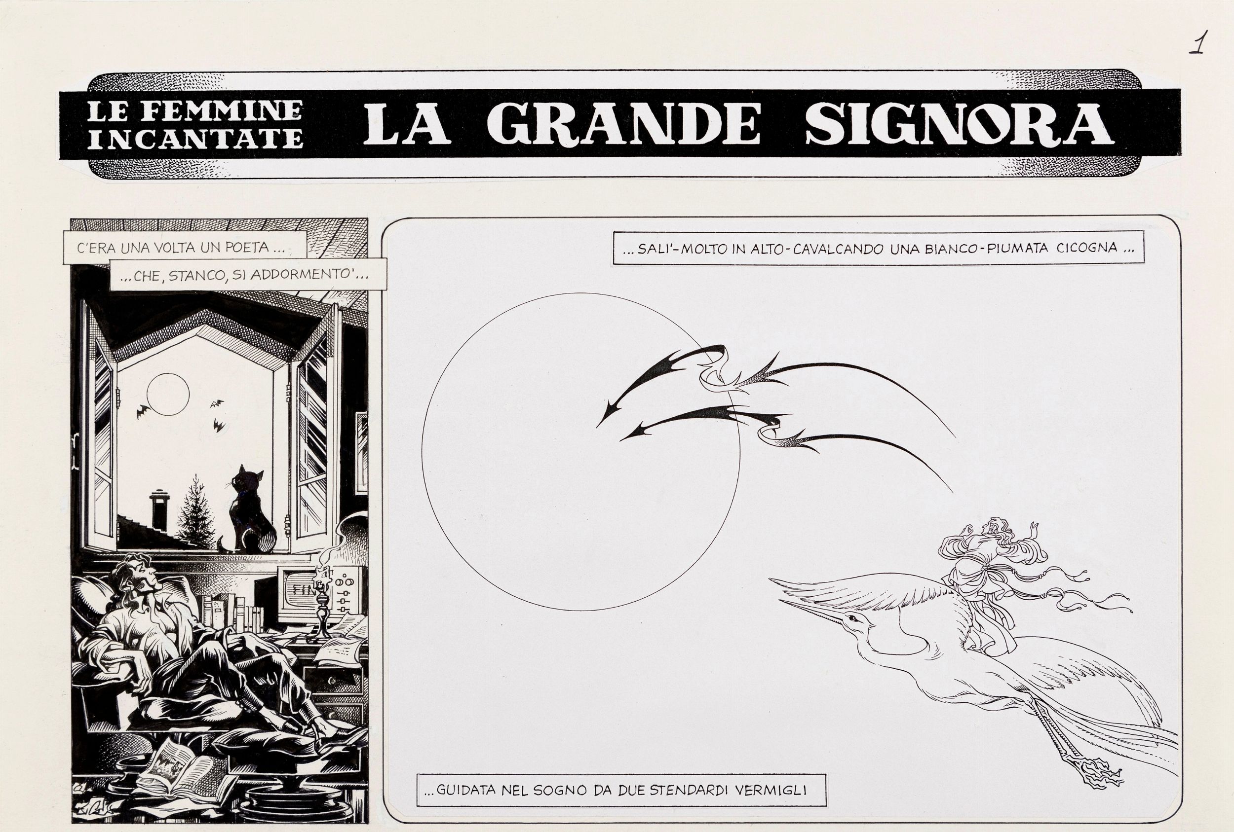 matita e china su cartoncino, 42 x 28,5 cm 1991 Tavola originale realizzata da Magnus per la parte superiore della pag. 1 de La grande signora, novella facente parte del ciclo de Le Femmine Incantate, edita per la prima volta sulla rivista Comic Art n. 77 nel marzo 1991. Il titolo e la seconda vignetta sono in fotocopia. Unanimemente riconosciuto come il capolavoro assoluto del maestro bolognese, Le Femmine Incantate raccolgono sette brevi novelle incentrate sul tema della femminilità e ispirate da un volume di racconti cinesi di fine ´600. Un´opera museale che ci dà la possibilità di apprezzare come non mai l´amore e la fatica che Magnus riversò in ogni singola vignetta della sue Femmine.