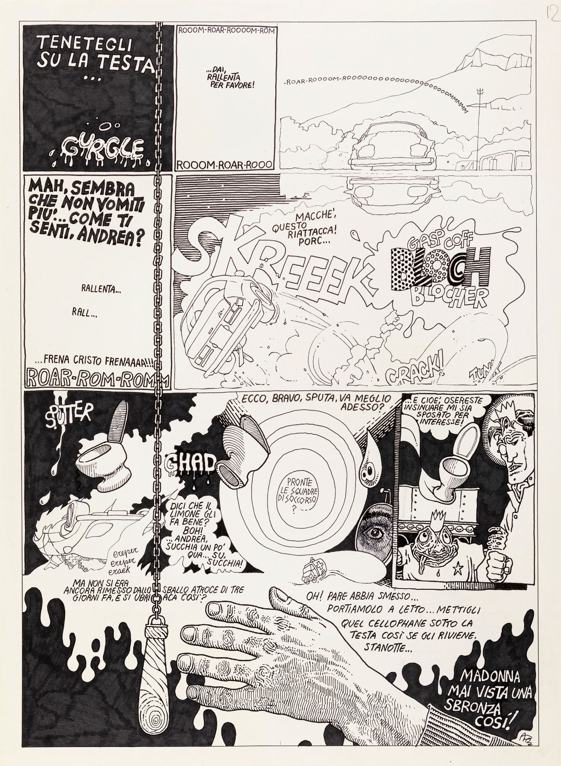1977 Tavola originale realizzata da Pazienza per la sua opera prima Le straordinarie avventure di Pentothal (tav. 12) edita per la prima volta sulla rivista Alter Alter nel 1977. Le straordinarie avventure di Pentothal, opera realizzata da Pazienza a soli 21 anni, è il diario minuzioso dei sogni, le illusioni e le contraddizioni del suo autore e di un'intera generazione, quella della Bologna del 1977. Il linguaggio è un tripudio di slang, onomatopee, neologismi e sgrammaticature. Il tratto grafico è una felice anarchia espressiva tra suggestioni della Pop art e tratteggi ariosi sul modello di Moebius. Firmata.