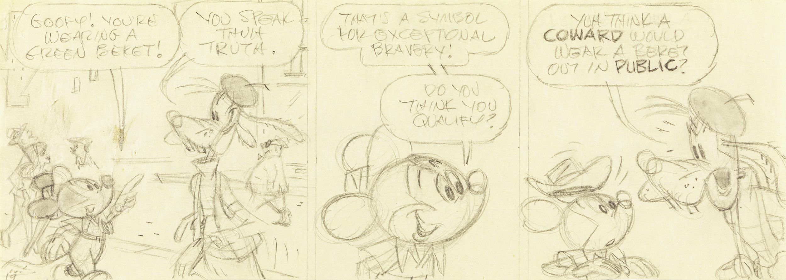 matita su carta, 32 x 11,5 cm anni '70 Striscia giornaliera preliminare realizzata da Gottfredson negli anni '70 per una strip di Mickey Mouse. Opera pubblicata sul volume Gli anni d'oro di Topolino n. 38 (cronologia dell'opera omnia di Floyd Gottfredson) dalla RCS nel 2010. È in questi tratti di matita risiede la vera arte di Floyd Gottfredson. Lievi pieghe e tre piccoli fori al margine sinistro. Si allega il certificato di provenienza e autenticità a firma di Norman Gottfredson, figlio dell'autore.