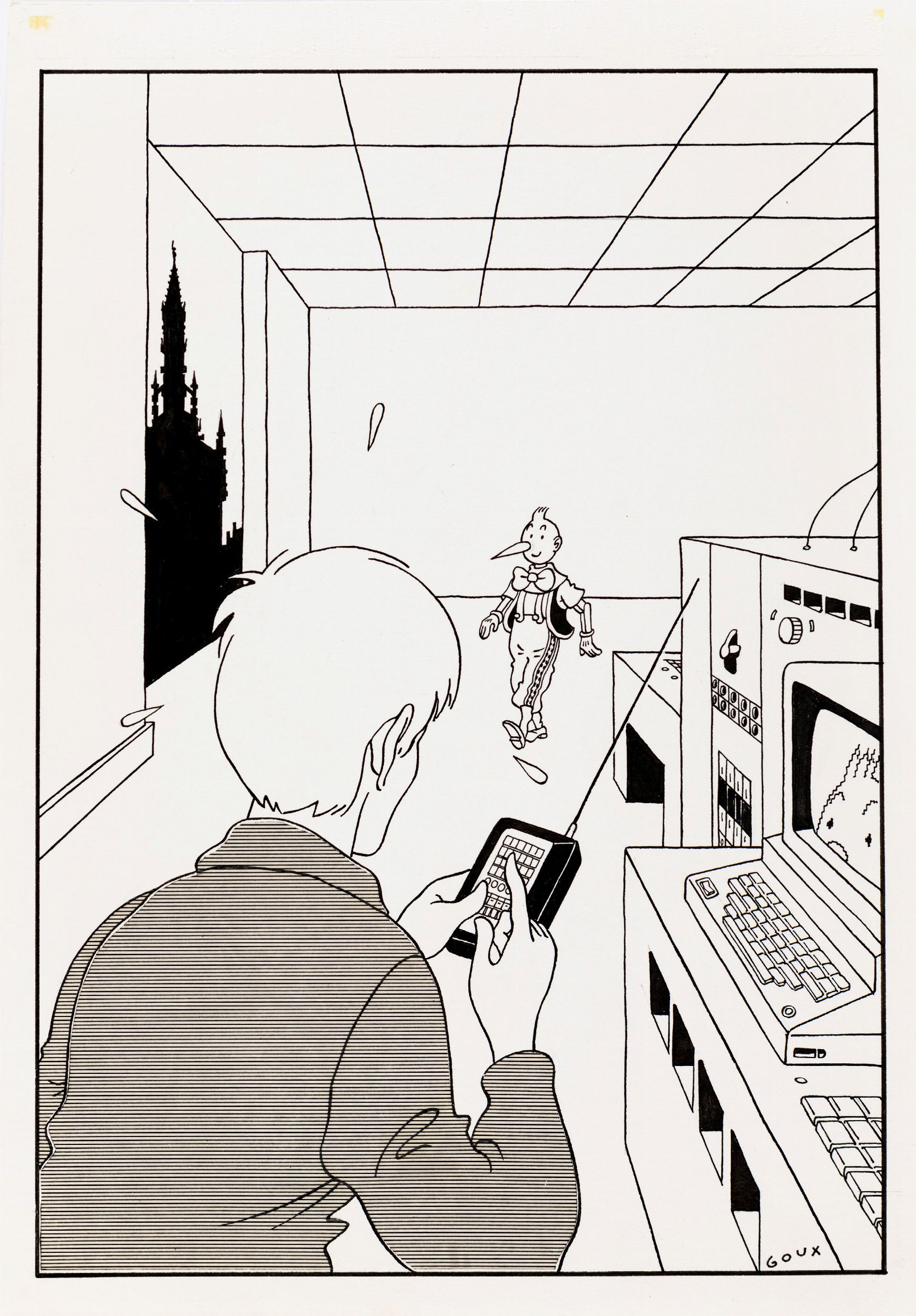 china e retino su cartoncino, 23 x 32,5 cm 1986 Illustrazione originale realizzata dal francese Goux in occasione della mostra Pinocchio graphis: un naso lungo duecento disegni inediti, tenutasi a Venezia nel 1986, pubblicata sull'omonimo catalogo edito dall'Editrice Montagna nel 1997. Firmata.
