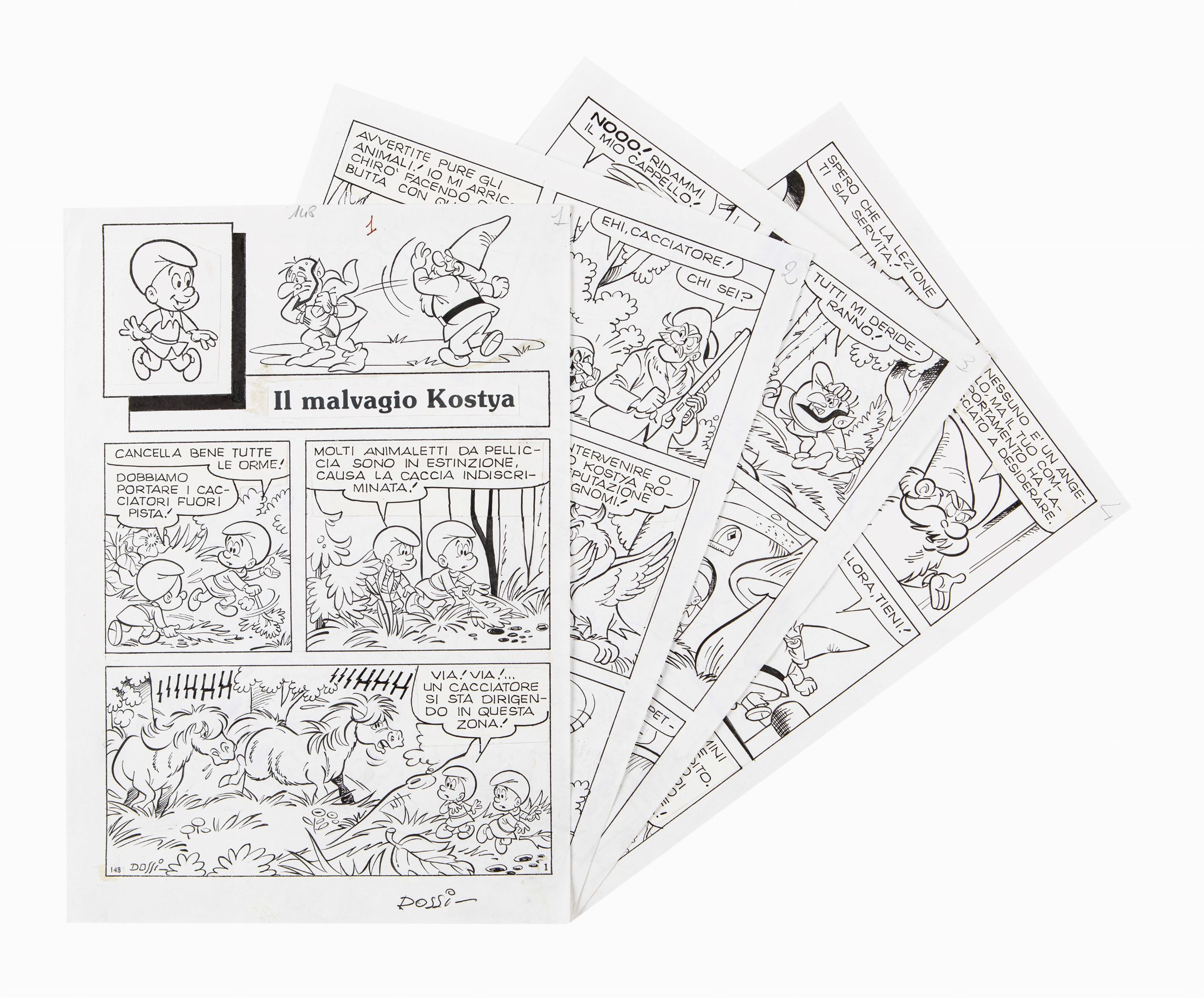 1986 Storia completa composta da 4 tavole originali realizzate da Dossi per Il malvagio Kostya, avventura dei suoi Puffi pubblicata su Geppo n. 148 dalla Bianconi nel 1986. Ogni pagina firmata.