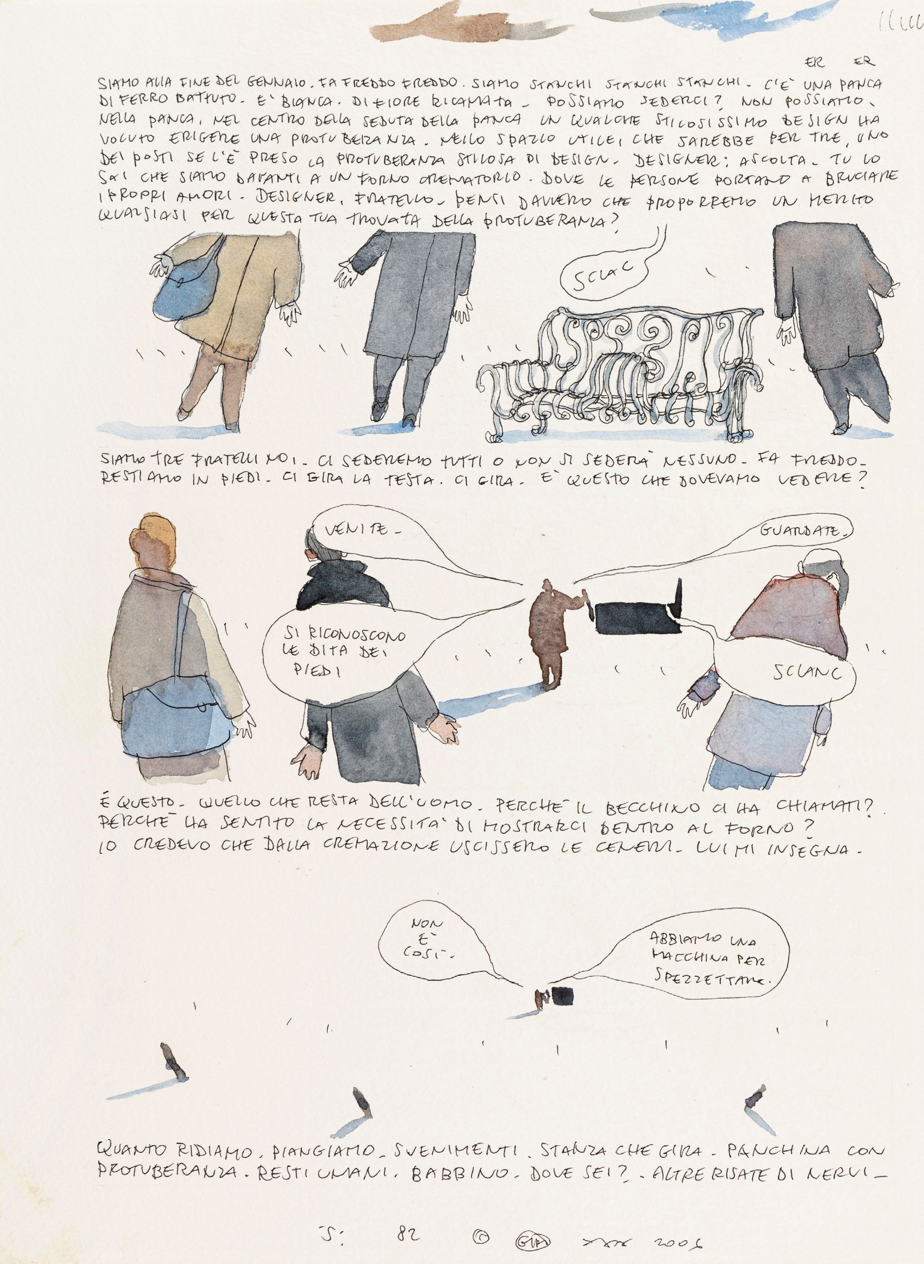 2006 Tavola originale realizzata da Gipi per S, edita a pag. 82 dalla Coconino nel 2006. Graphic novel tra le più apprezzate di Gipi, un lungo e affettuoso ricordo del padre appena scomparso, nel quale, data la natura autobiografica del racconto, l’autore ha dato spazio a una narrazione più immediata e istintiva portando l'emozionalità del testo ad una vetta fino ad allora mai raggiunta. Firmata, datata e titolata.