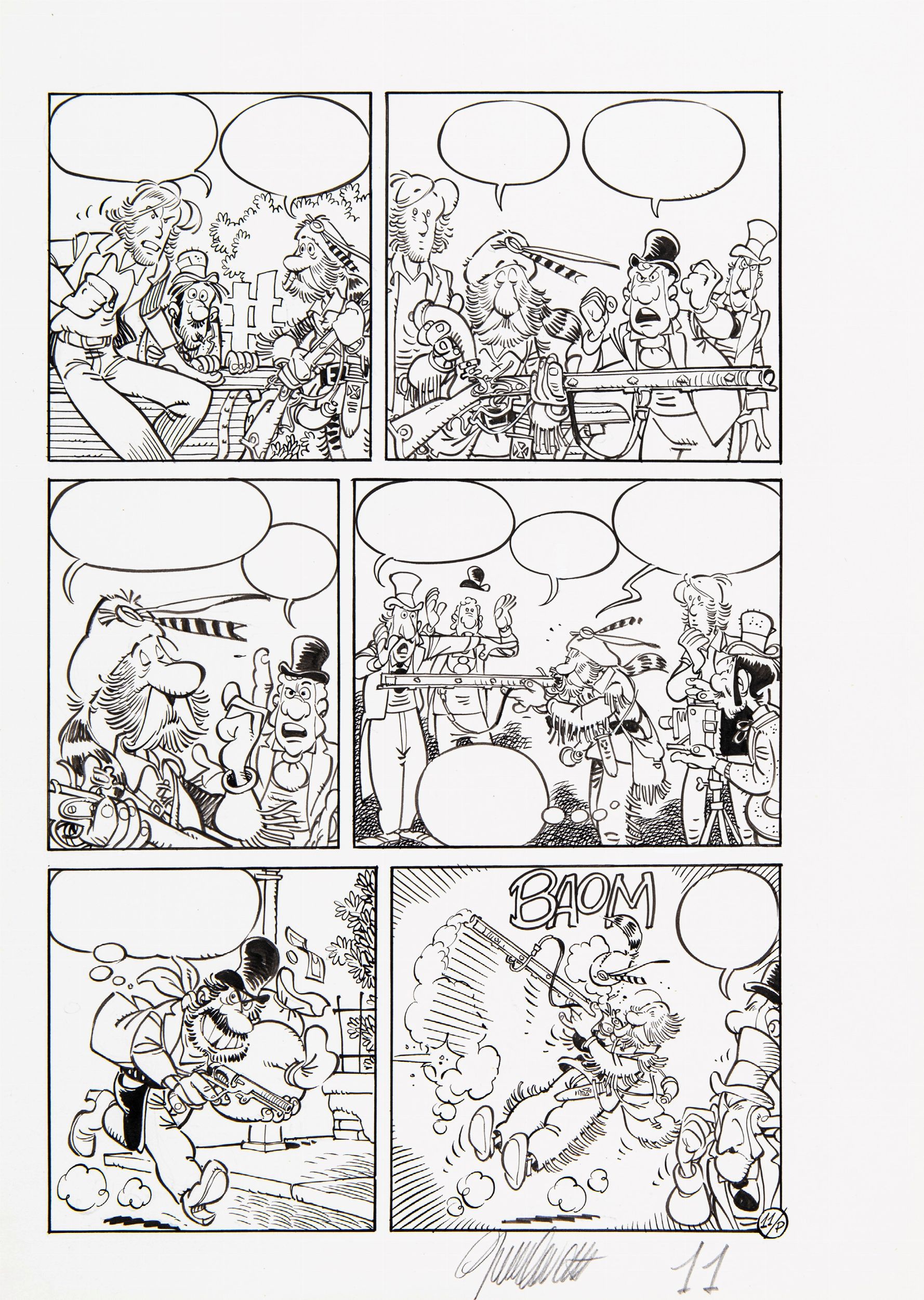 matita e china su cartoncino, 25 x 35 cm 1980 Tavola originale realizzata da Cavazzano per la pag. 11 di un’avventura di Silas Finn, personaggio creato insieme a Sclavi nel 1979 per la rivista tedesca Zack. Silas Finn, professione reporter, e B. J. Crocker, fotografo, vengono inviati nel vecchio West dal direttore del Boston Tribune a caccia di notizie mirabolanti per aumentare la tiratura del giornale. Firmata.