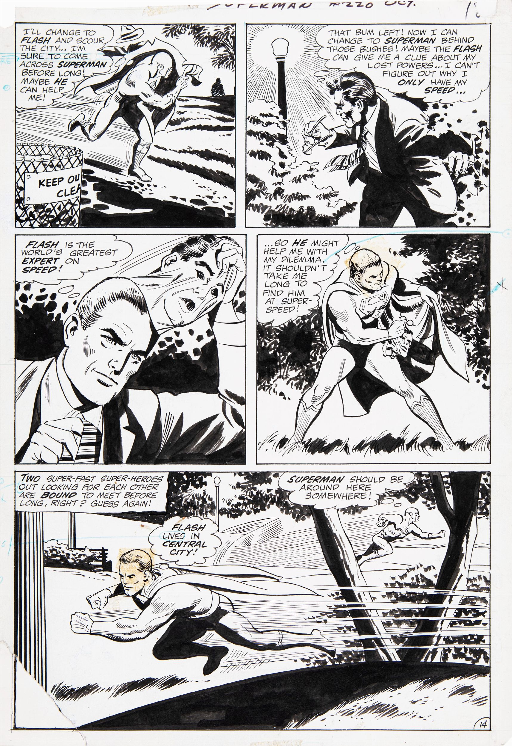 1969 Tavola originale realizzata da Swan per Who Stole My Super-Powers?, edita Superman n. 220 a pag. 14 dalla DC nel 1969. Mancanze agli angoli.