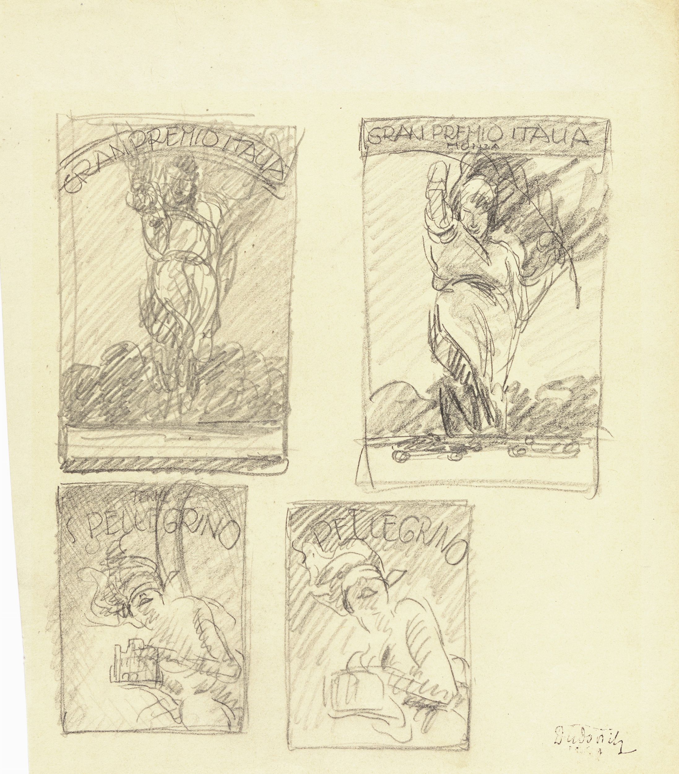 anni '10 Bozzetto originale realizzato da Dudovich durante gli anni '10 per i manifesti delle Terme di San Pellegrino e per il Gran Premio di Monza. Timbrato.