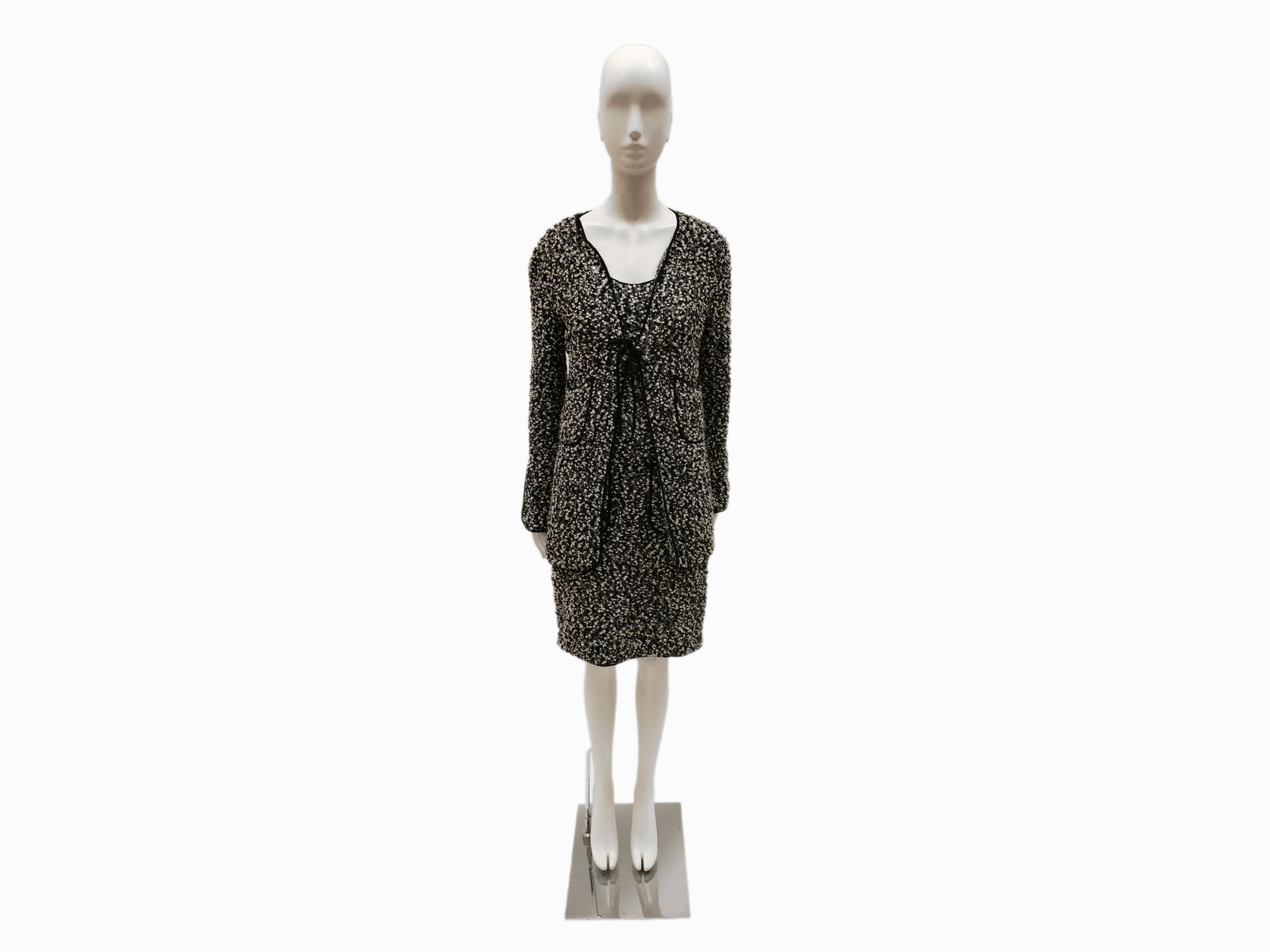 impreziosito da paillette trasparenti, composto da una giacca a cardigan con chiusura a cordino, due tasche a toppa, maniche con bottoni monogram, e tubino senza maniche