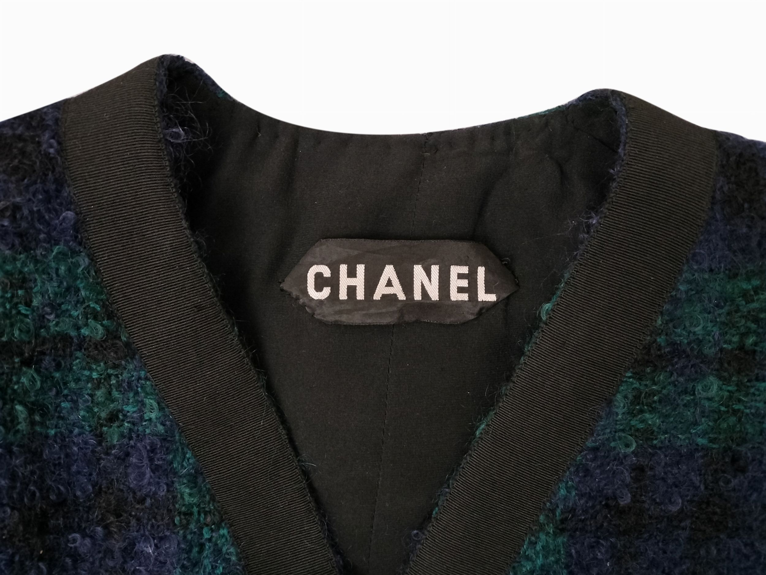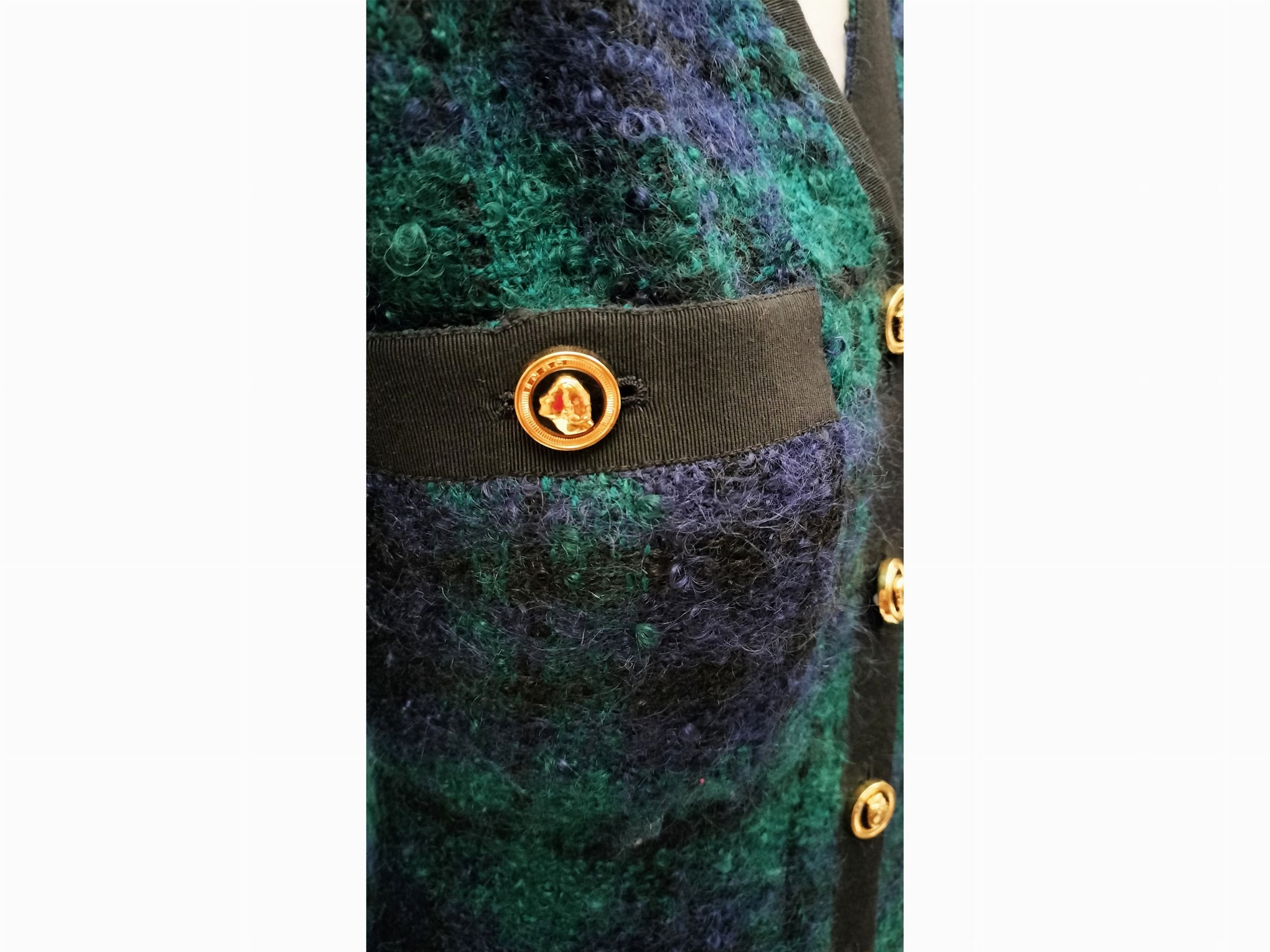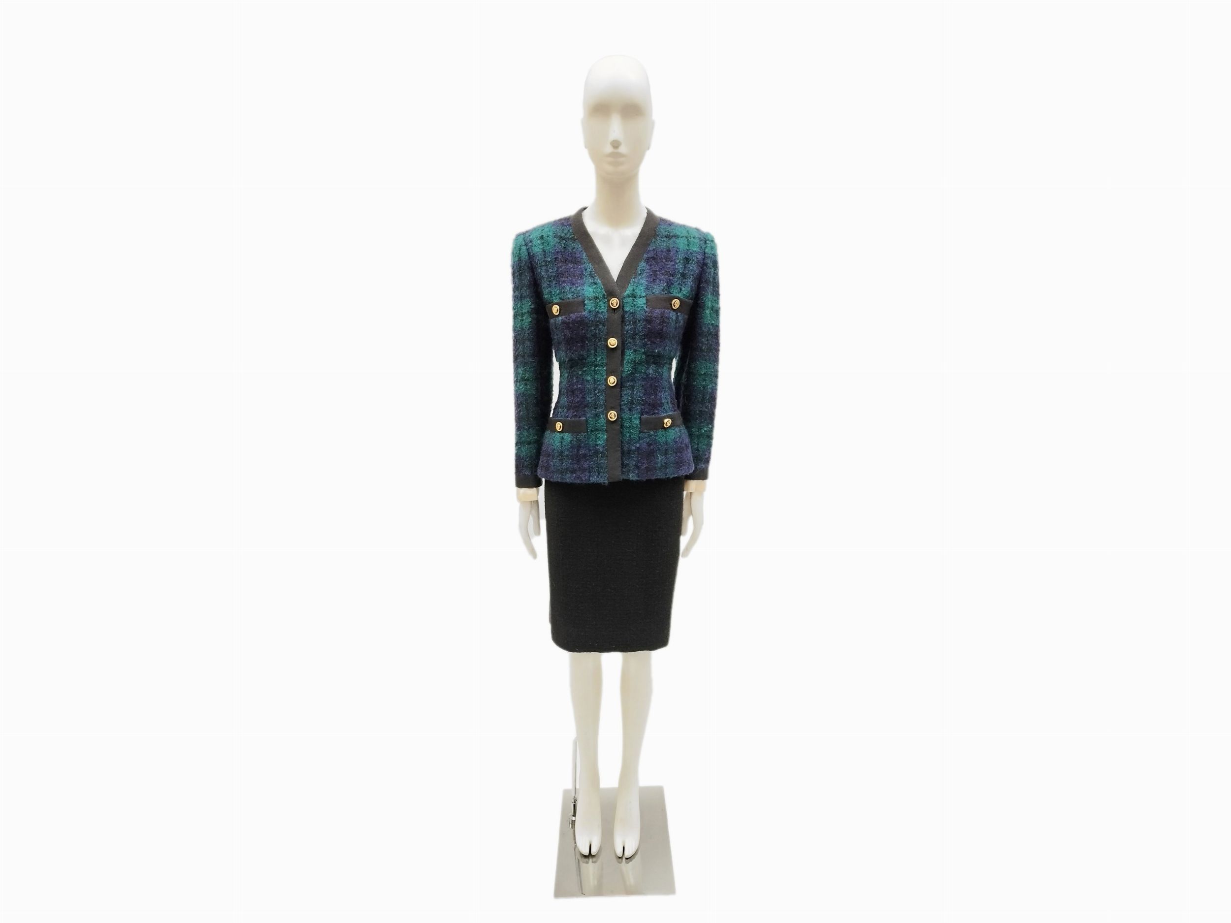 tg 42 (circa) (2) composto da giacca avvitata con fantasia tartan nei toni del verde e del blu, quattro taschini a filetto, bordure in gres nero, bottoni decorati con il profilo di Inès de la Fressange, bordura in gros nero, polsini in raso bianco, all'interno catena dorata, gonna nera dritta; in un taschino si trova un biglietto con il nome della persona per cui è stato realizzato
