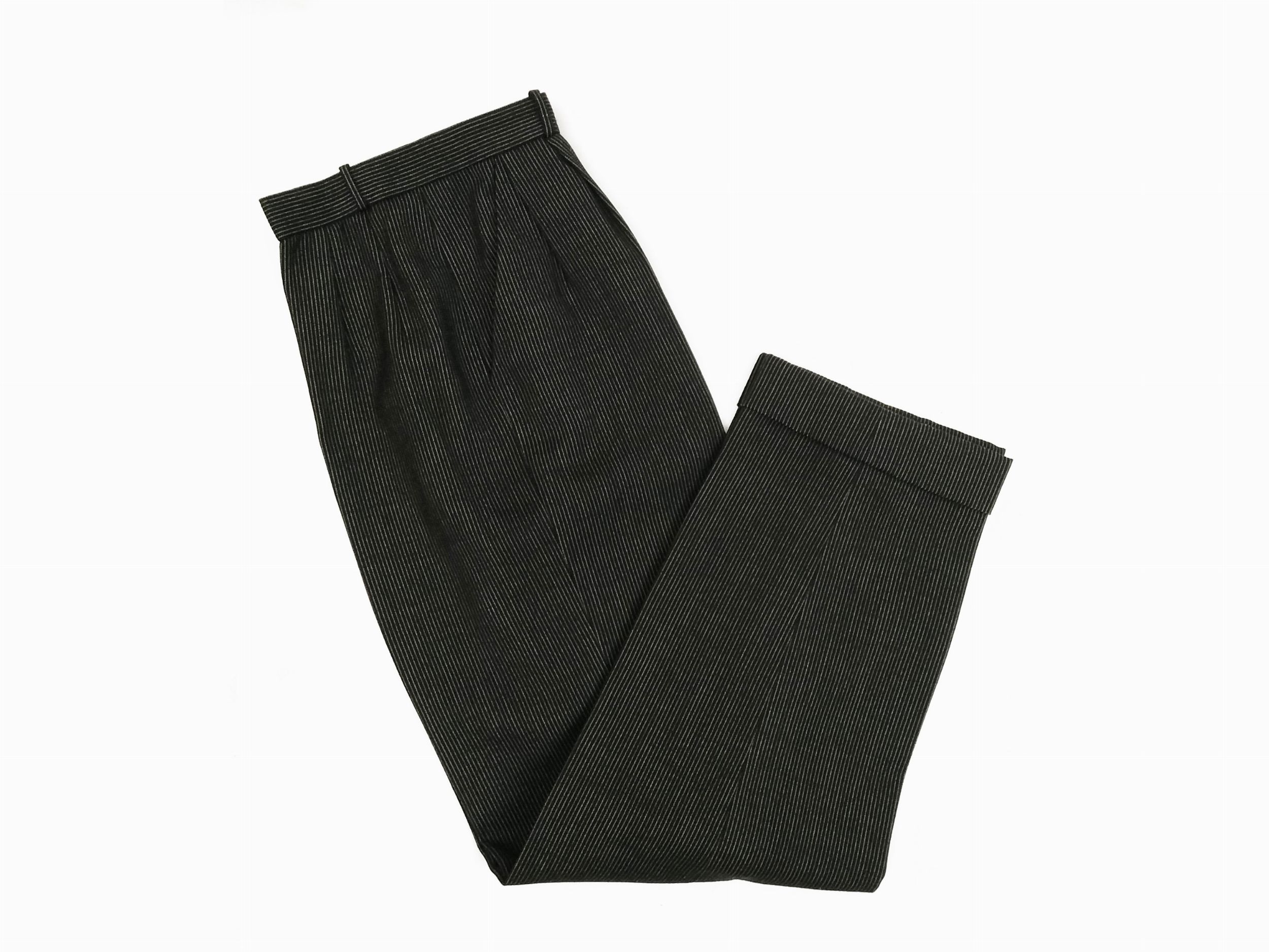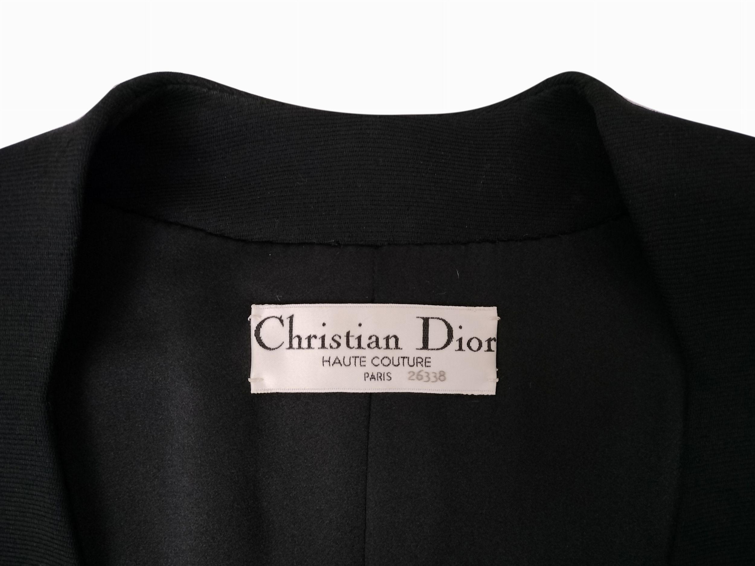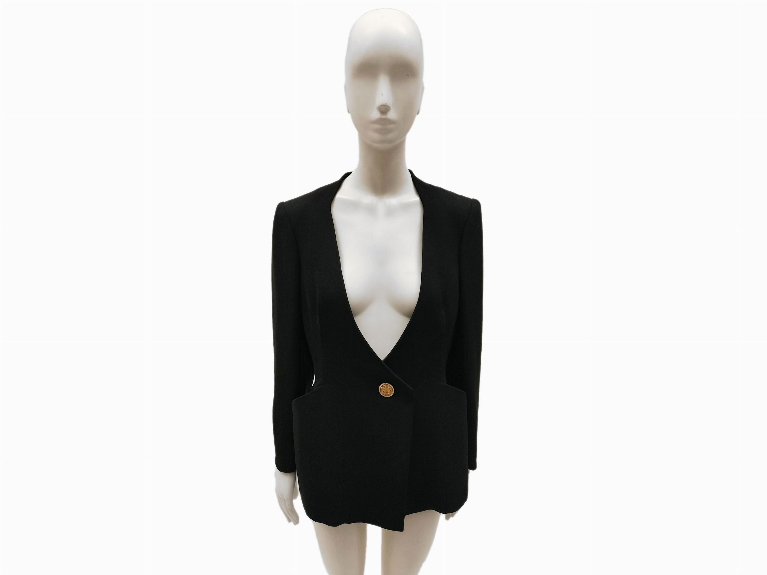 composto da giacca nera in gros con bottone gioiello, ed pantaloni dritti in tessuto rigato a vita alta (2)