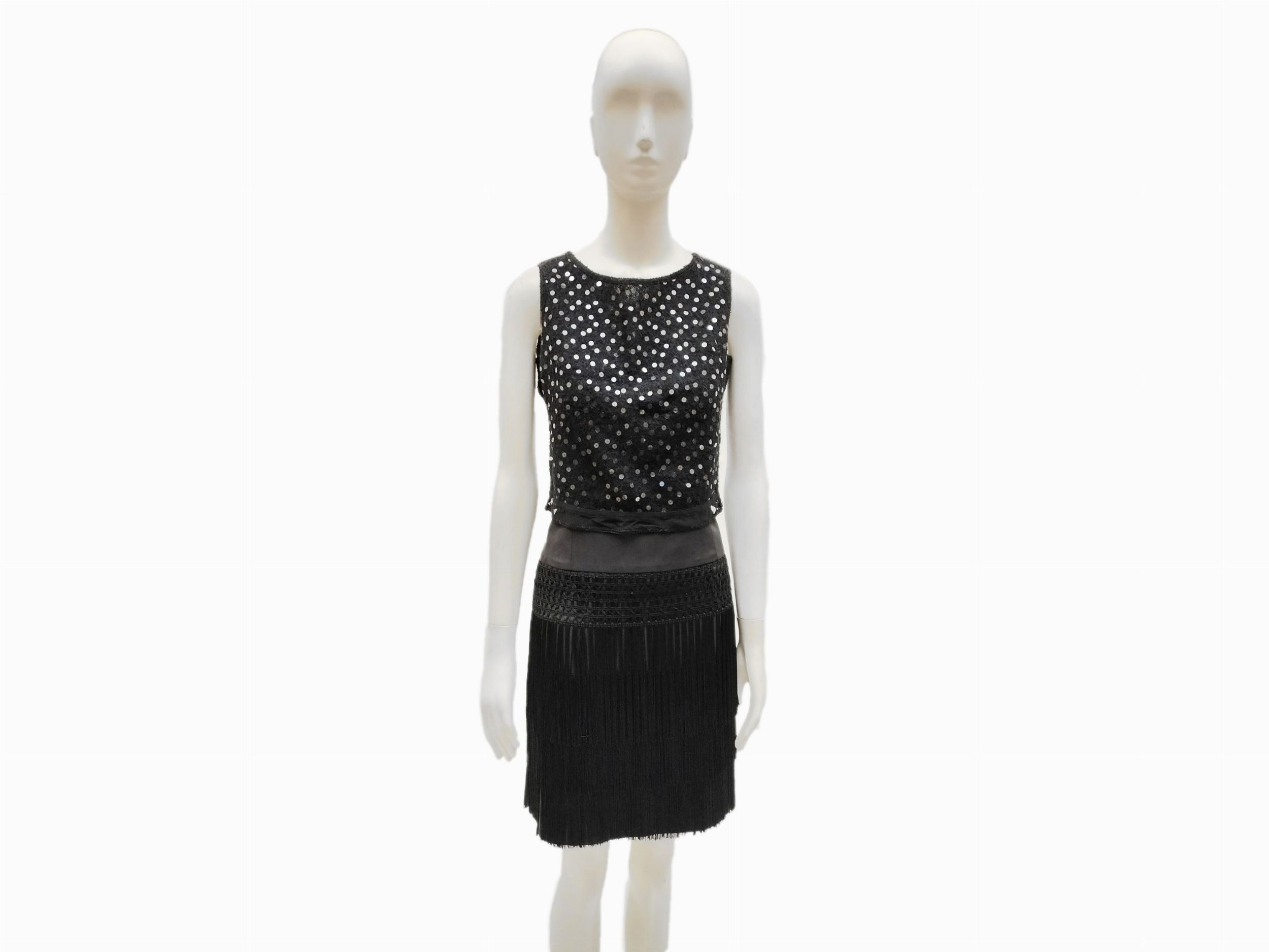 composto da una gonna firmata Emporio Armani con frange ed una canottiera in maglia nera con paillettes firmata Ritmo di Perla