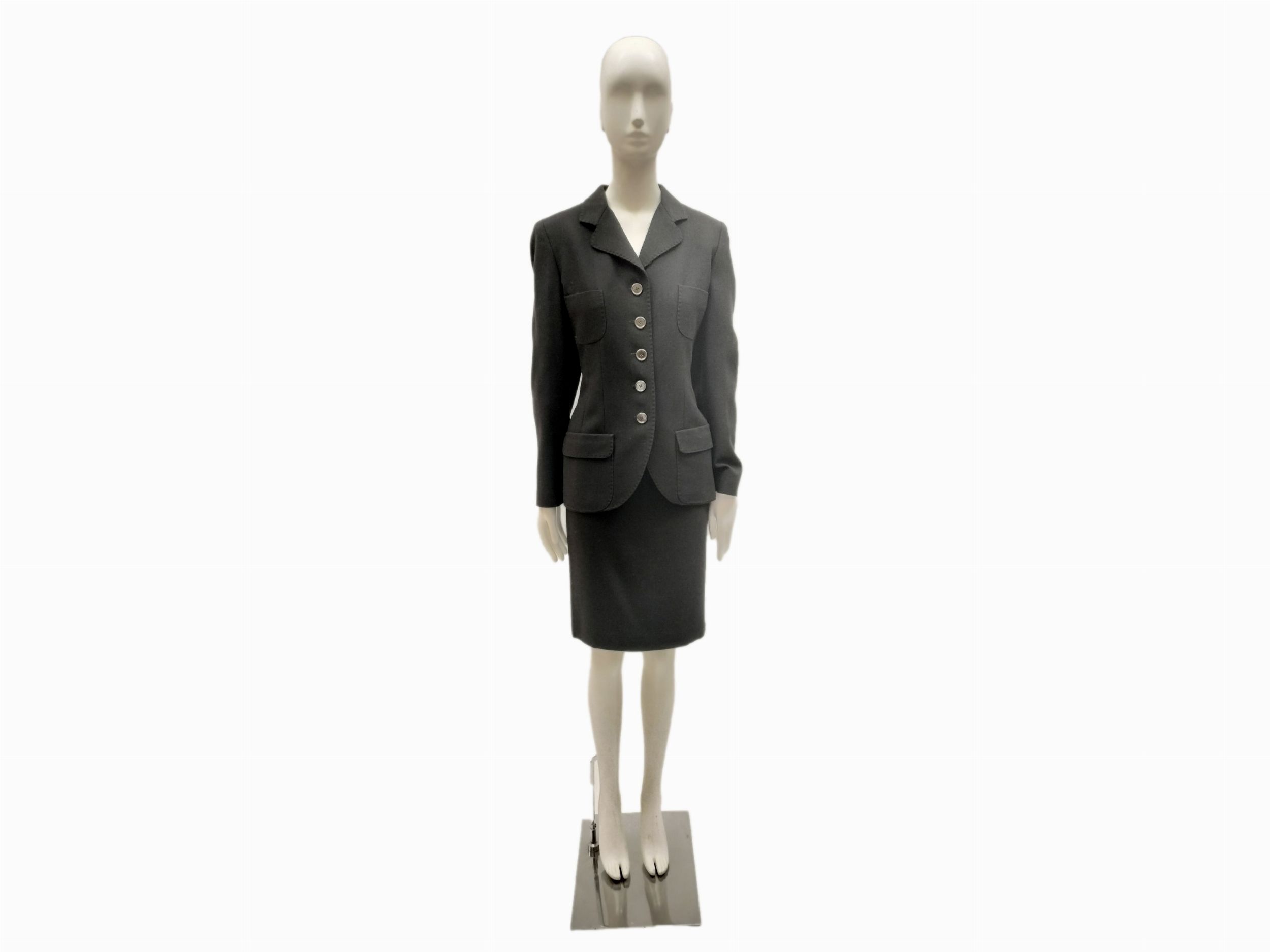 composto da giacca avvitata con bottoni in metallo ed una gonna a tubino sotto il ginocchio