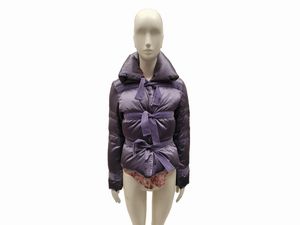 tg 42 un piumino lilla con dettagli in velluto su tono e collo con passaggio per foulard, interno foderato con [..]