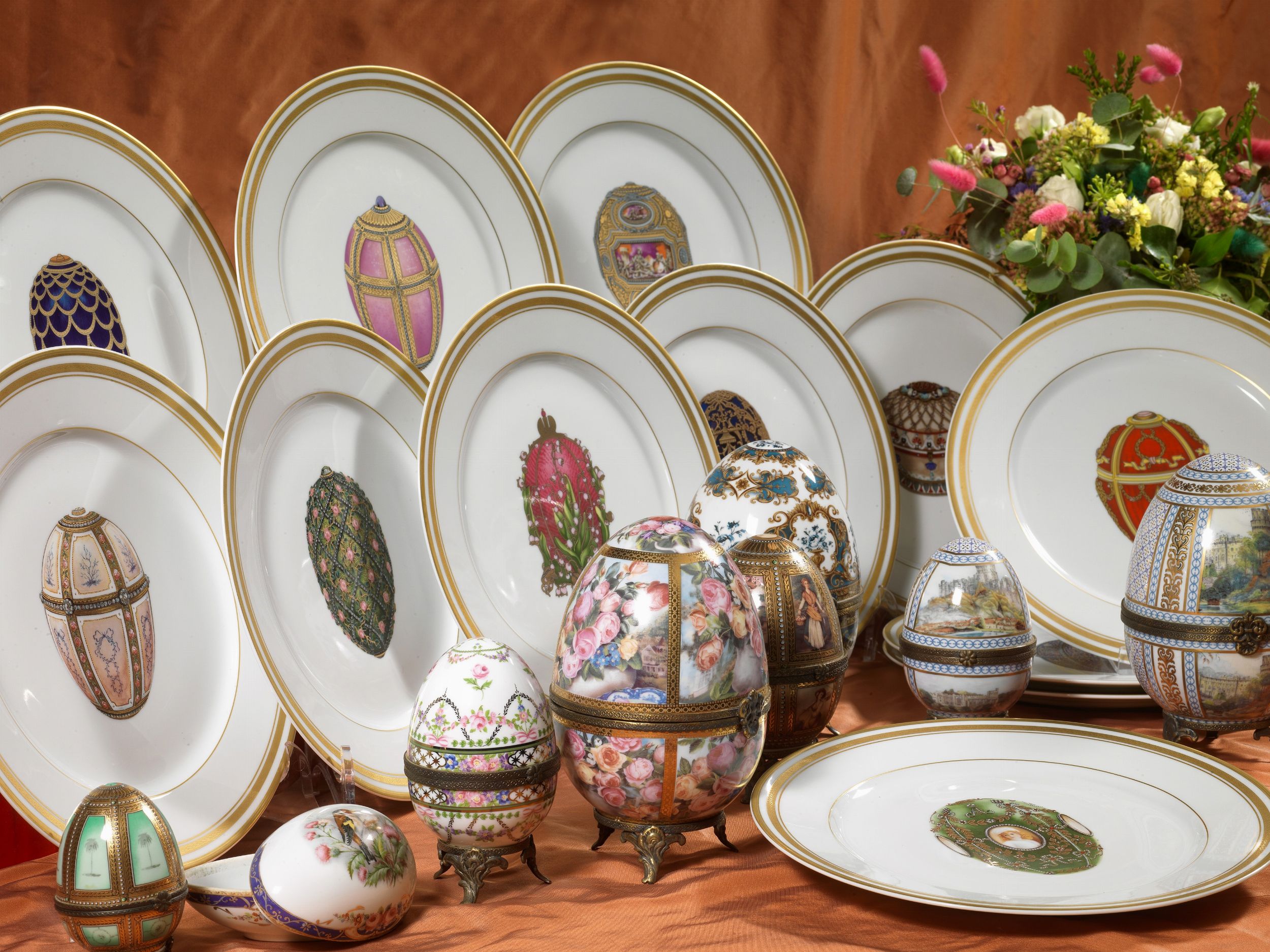 Dodici piatti in porcellana Limoges con uova Fabergé