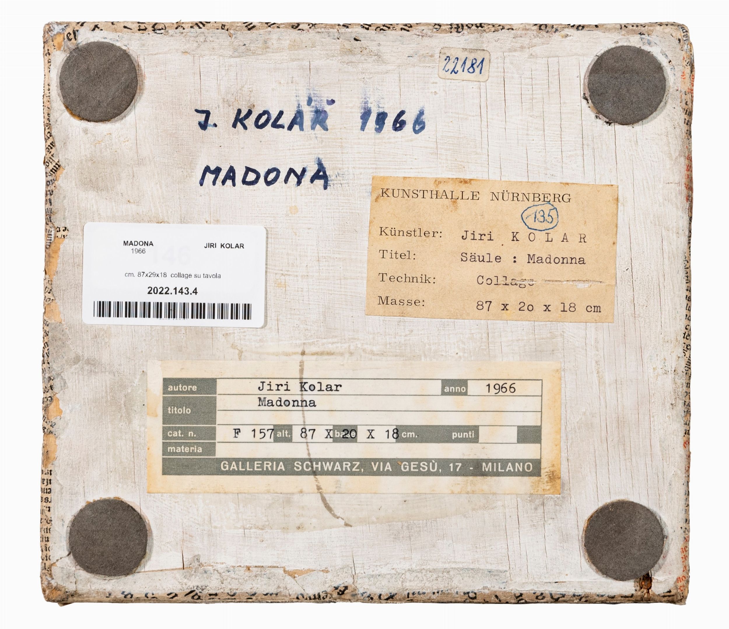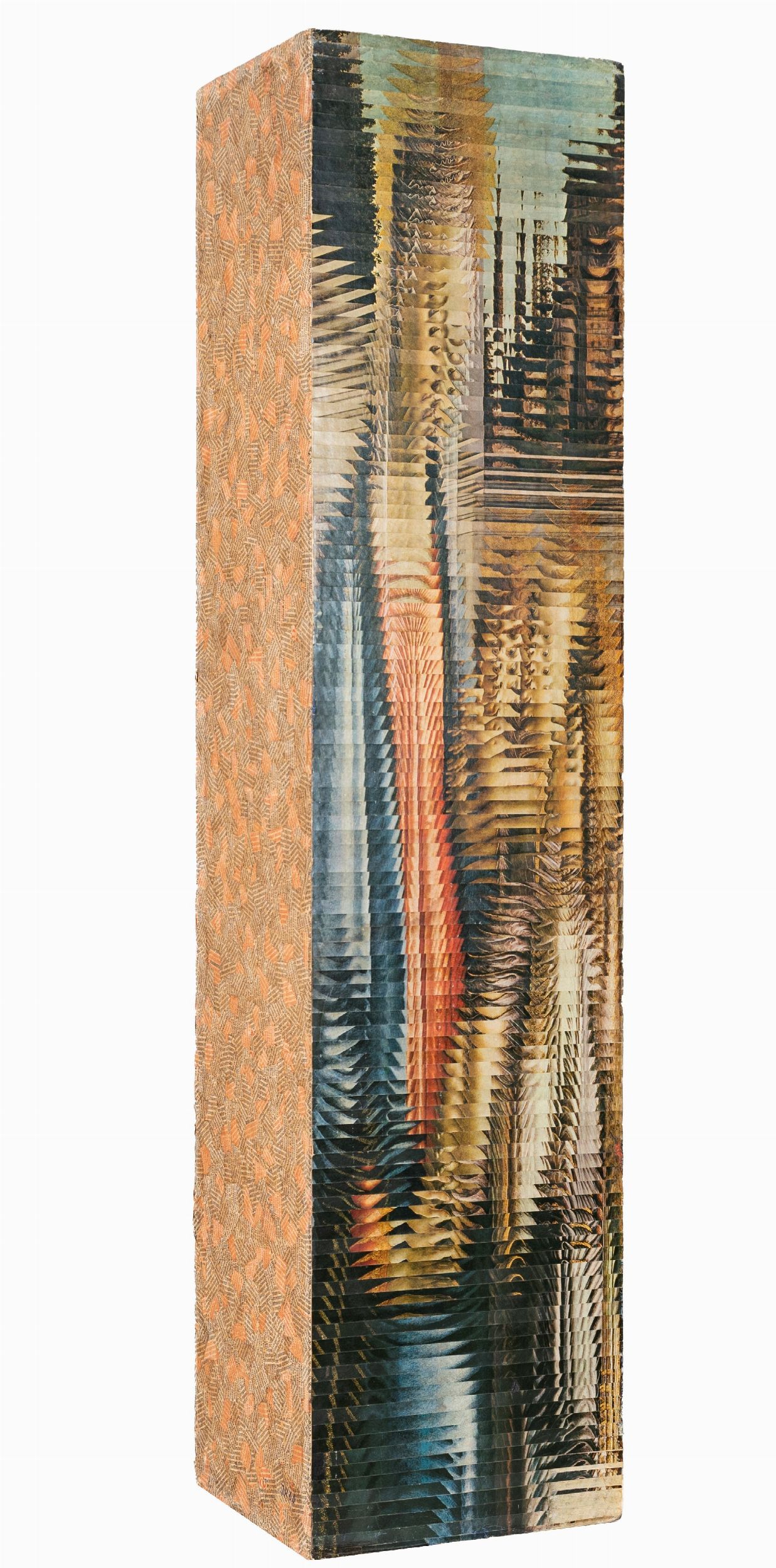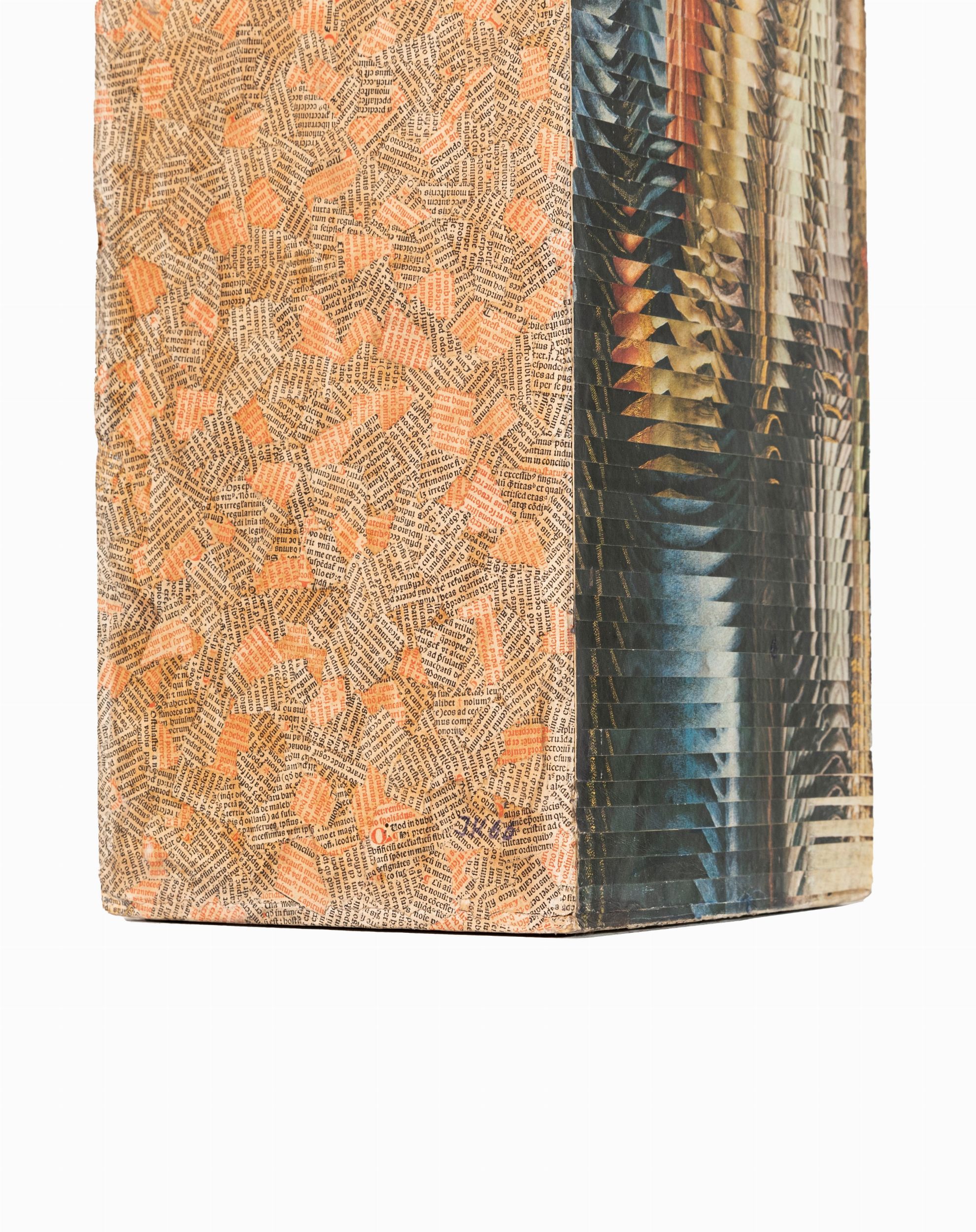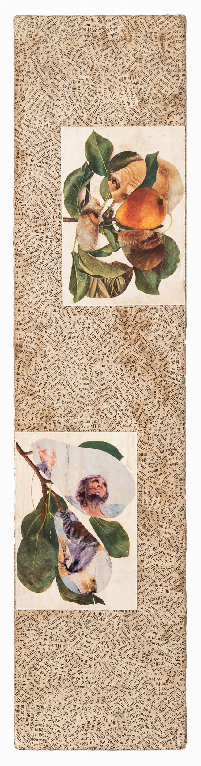 collage (rollage, chiasmage, intercalage) su scultura in legno, cm. 87x20x18