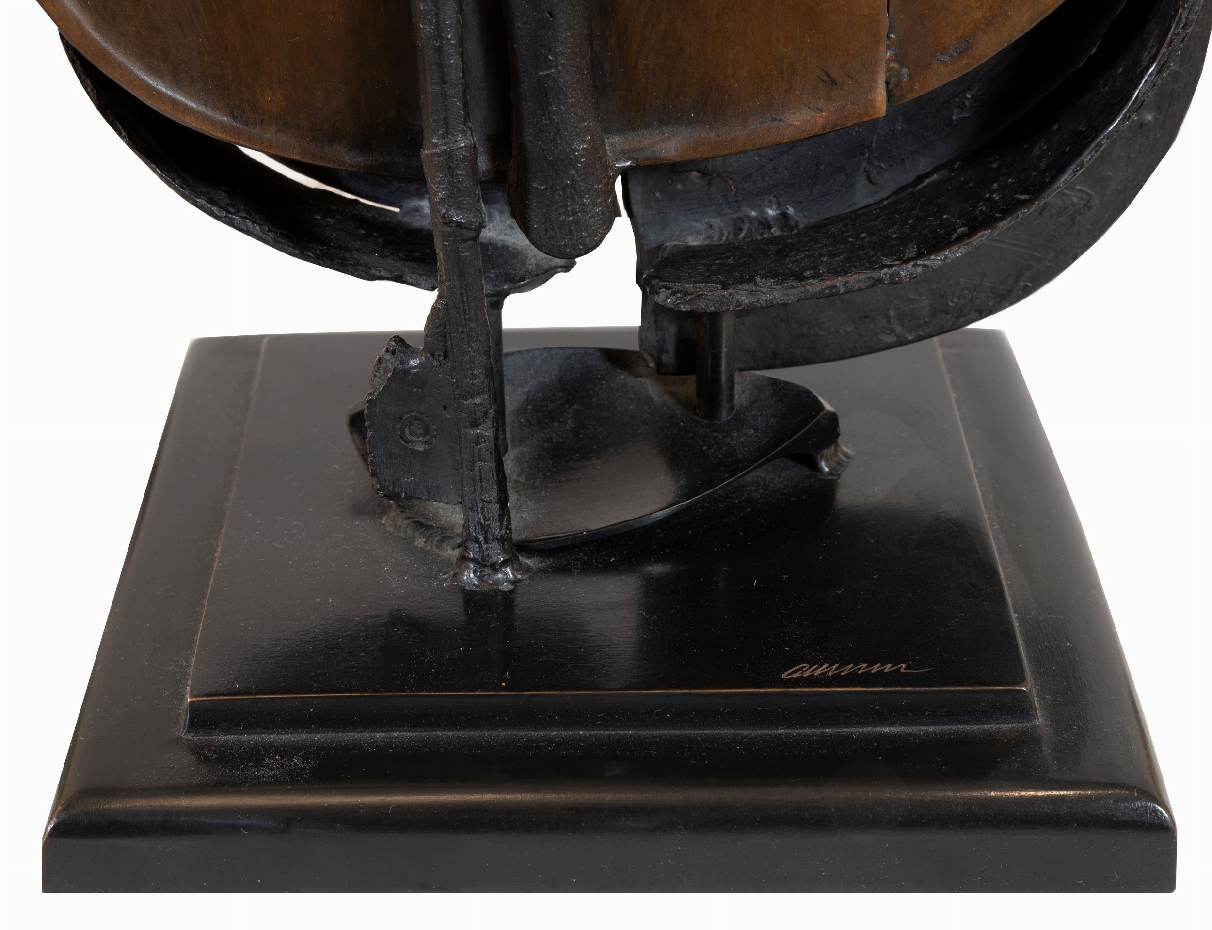 violino e arco bruciati in bronzo fuso con patina marrone e nera su base incorporata, es. EA 6/20, cm. 70x23x18,5