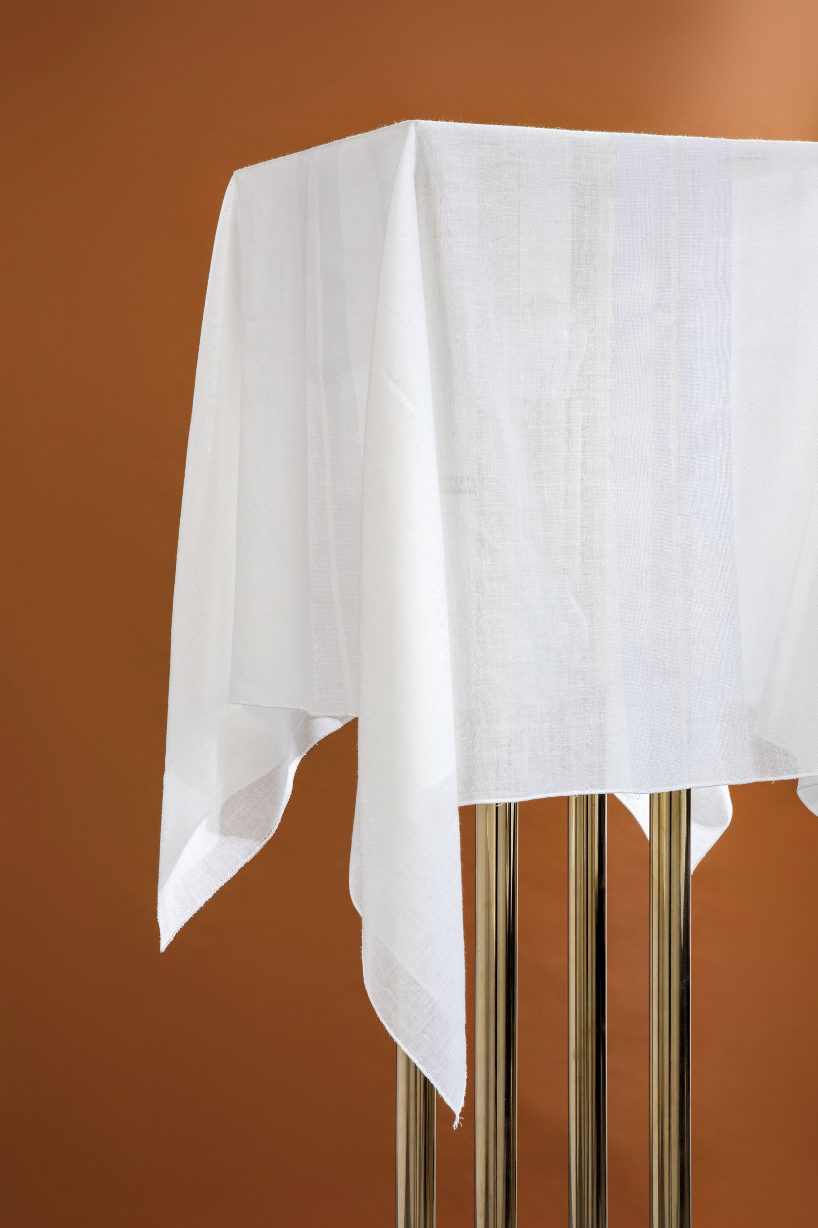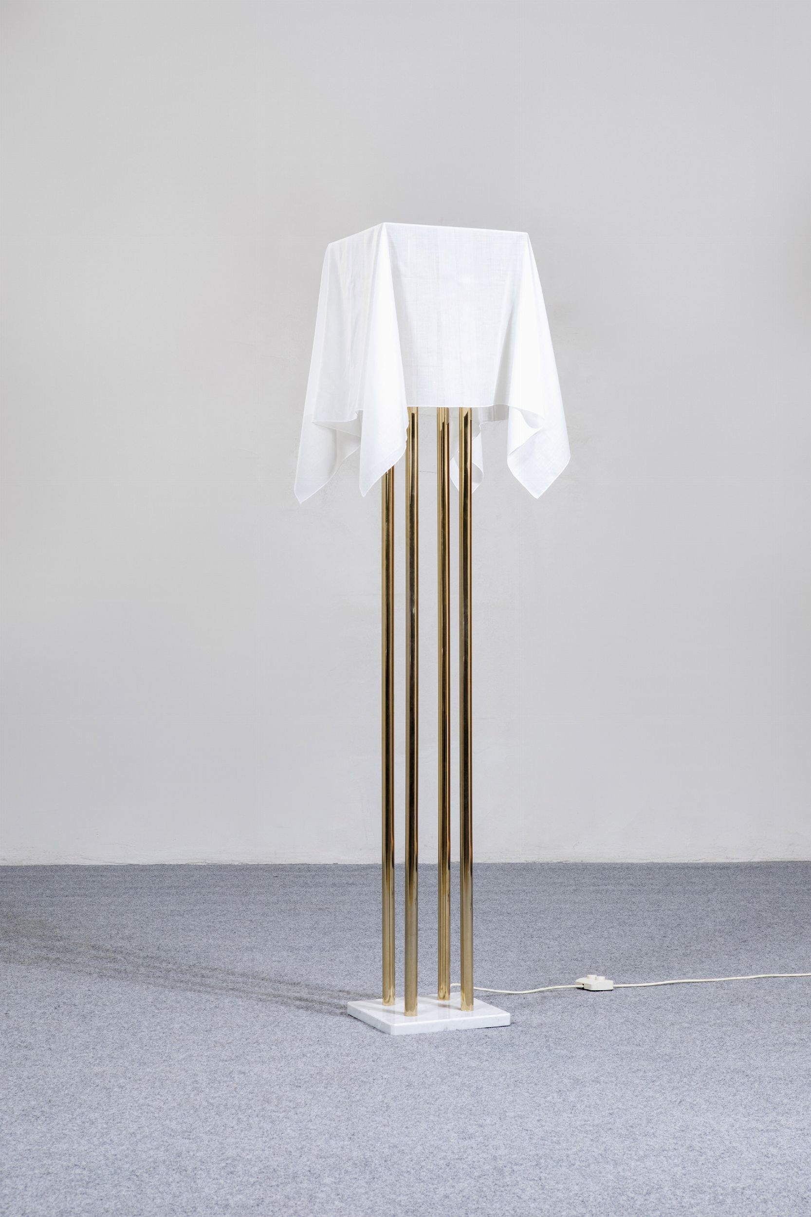 Struttura in ottone e base in marmo. Diffusore in tessuto.
